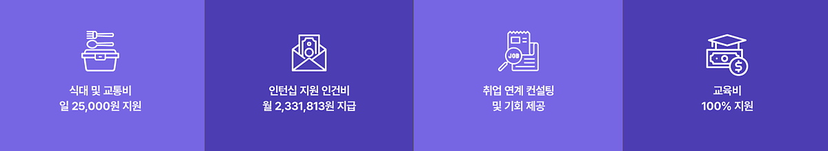 인턴십 기간은 실무를 현장에서 배울 수 있는 중요한 시간입니다. 이런 과정들이 모두 포함되어 있어 전문적인 인력으로 성장할 수 있는 발판이 될 수 있습니다. 인턴십 기간에는 급여를 받게 되는데요. 3개월 간 주 5일 근무를 하게 되고 임금은 월 2,331,813원을 받습니다. 주휴수당, 연차, 휴가, 4대보험 등 안정된 근로조건을 보장하고 있습니다.