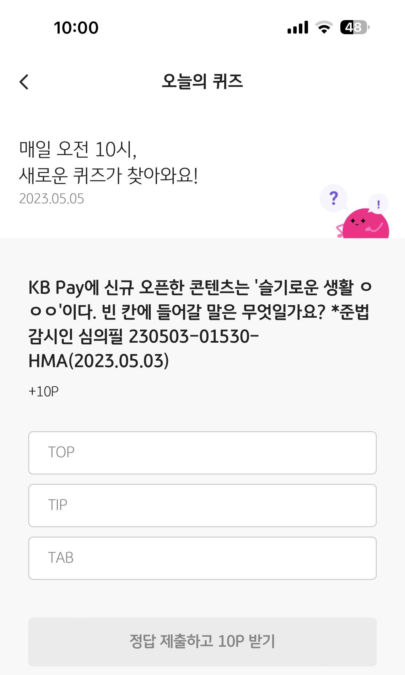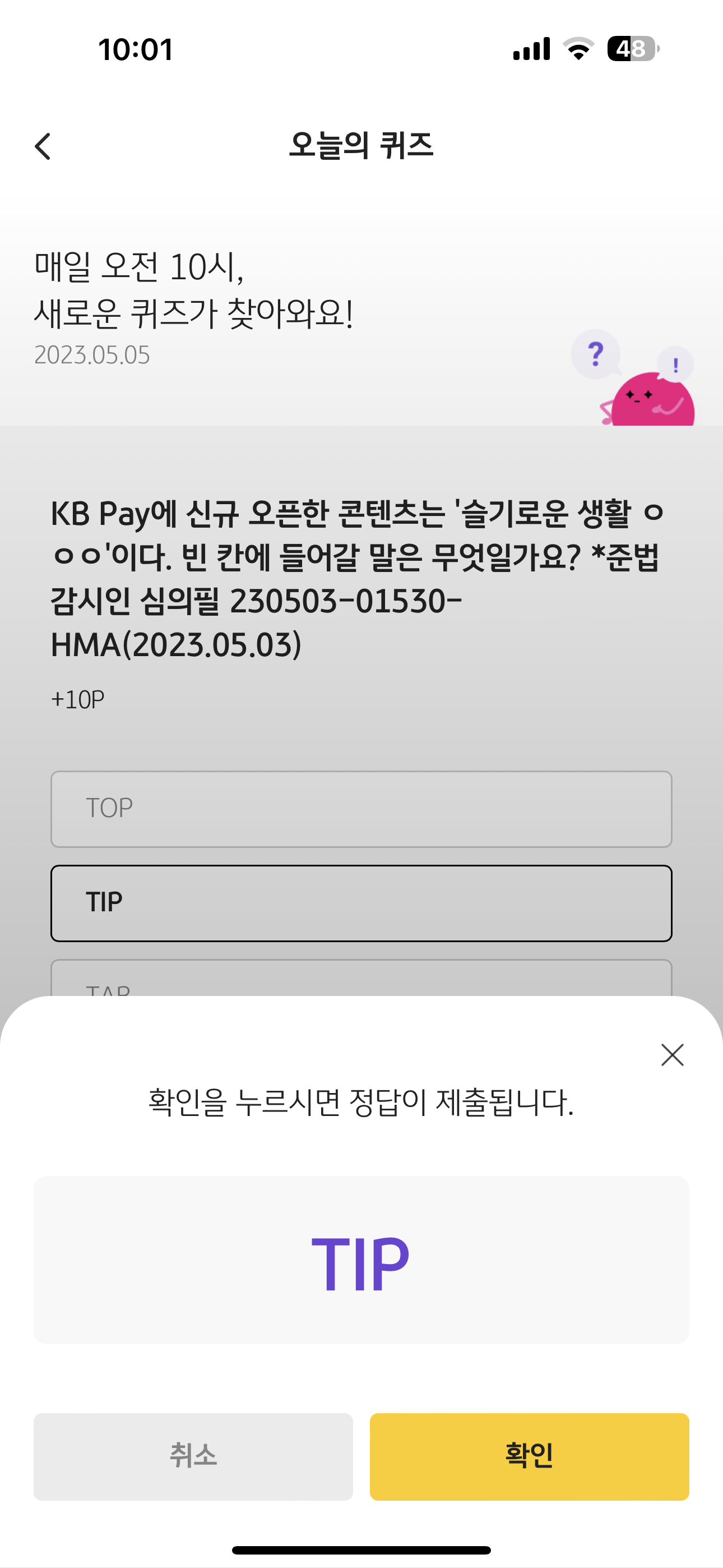 KB Pay 오늘의 퀴즈 정답은 TIP 입니다