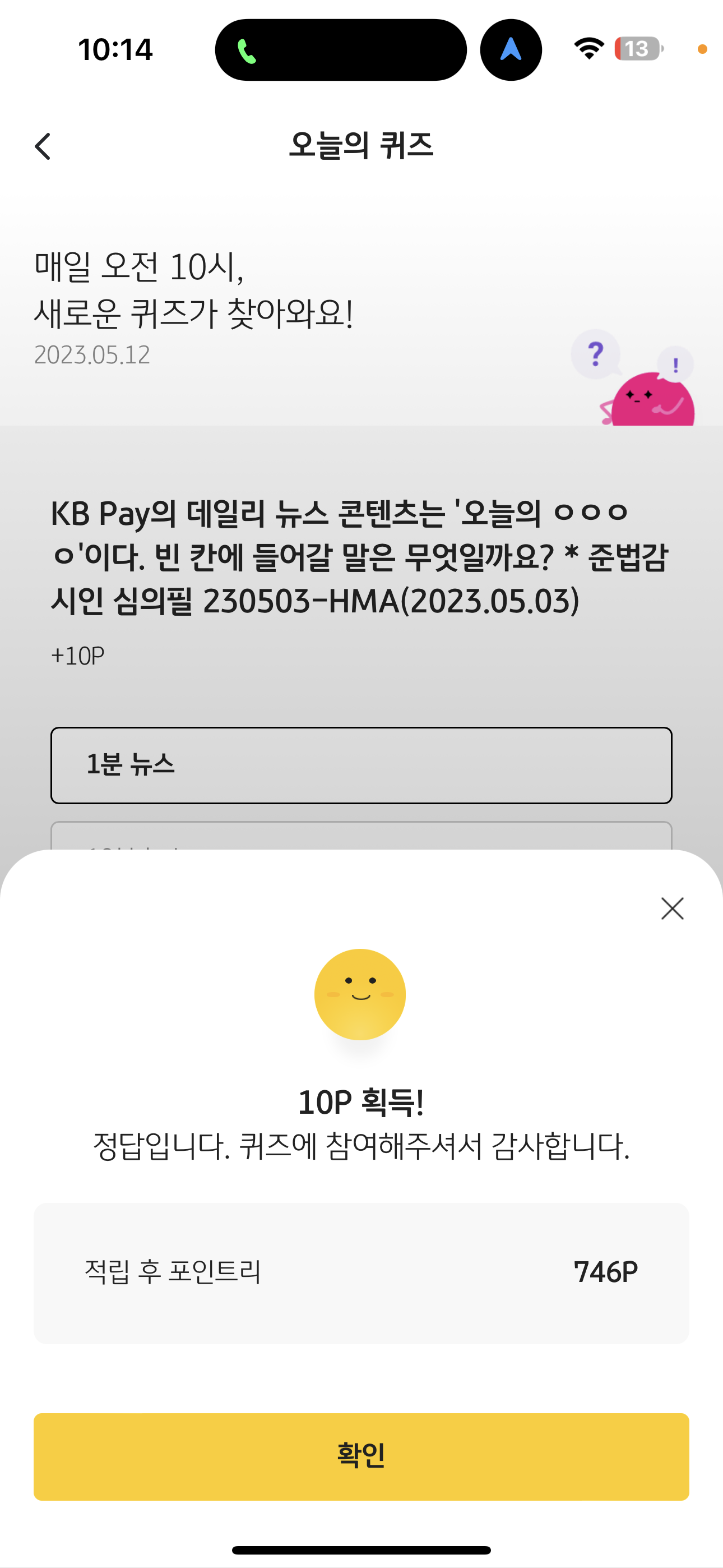 KB Pay 오늘의 퀴즈 정답은 1분 뉴스 입니다.