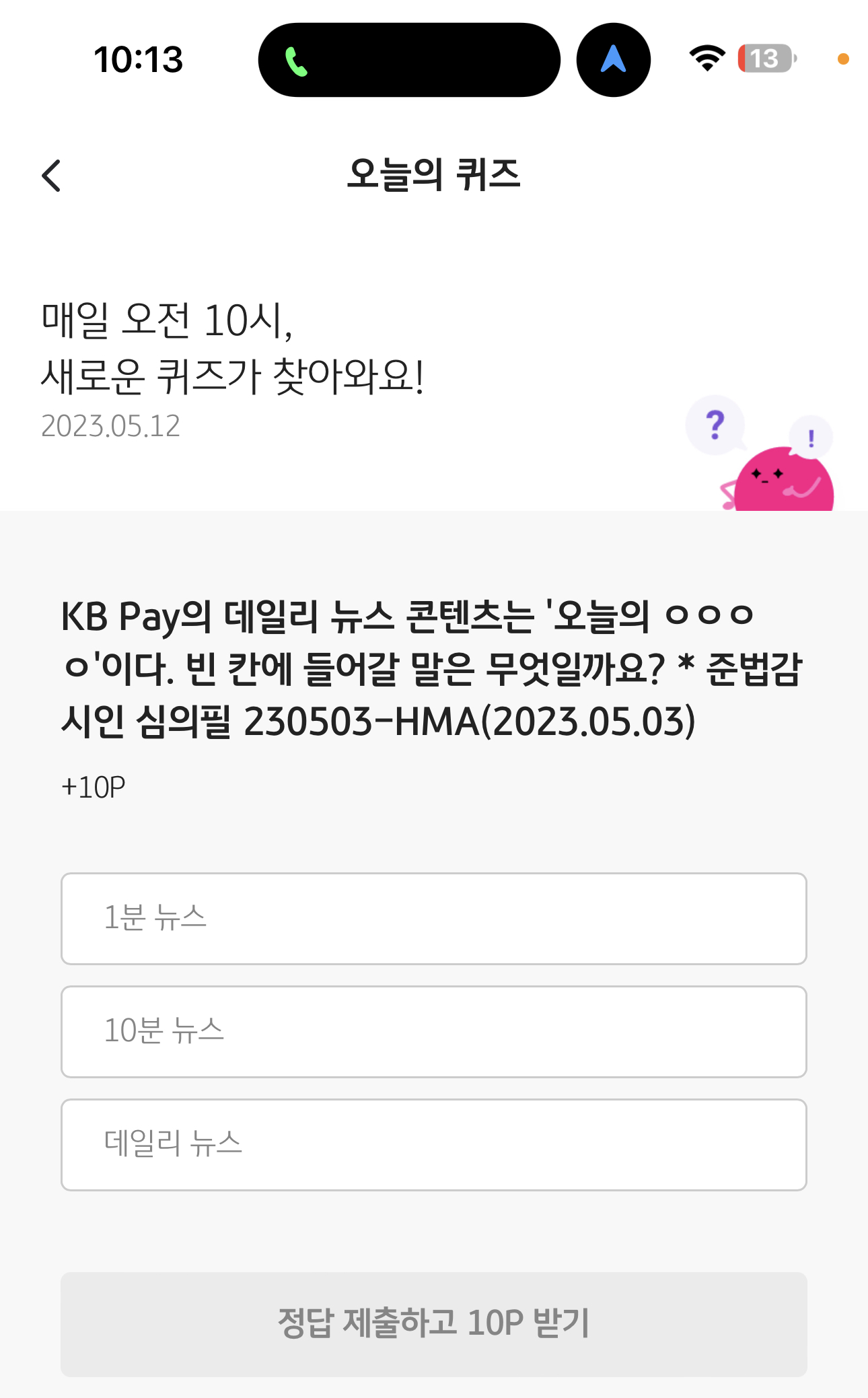 KB Pay의 데일리 뉴스 콘텐츠는 '오늘의 oooo'이다. 빈 칸에 들어갈 말은 무엇일까요? *준법감시인 심의필 230503-HMA(2023.05.03) 보기는 1. 1분 뉴스 2. 10분 뉴스 3. 데일리 뉴스 입니다.