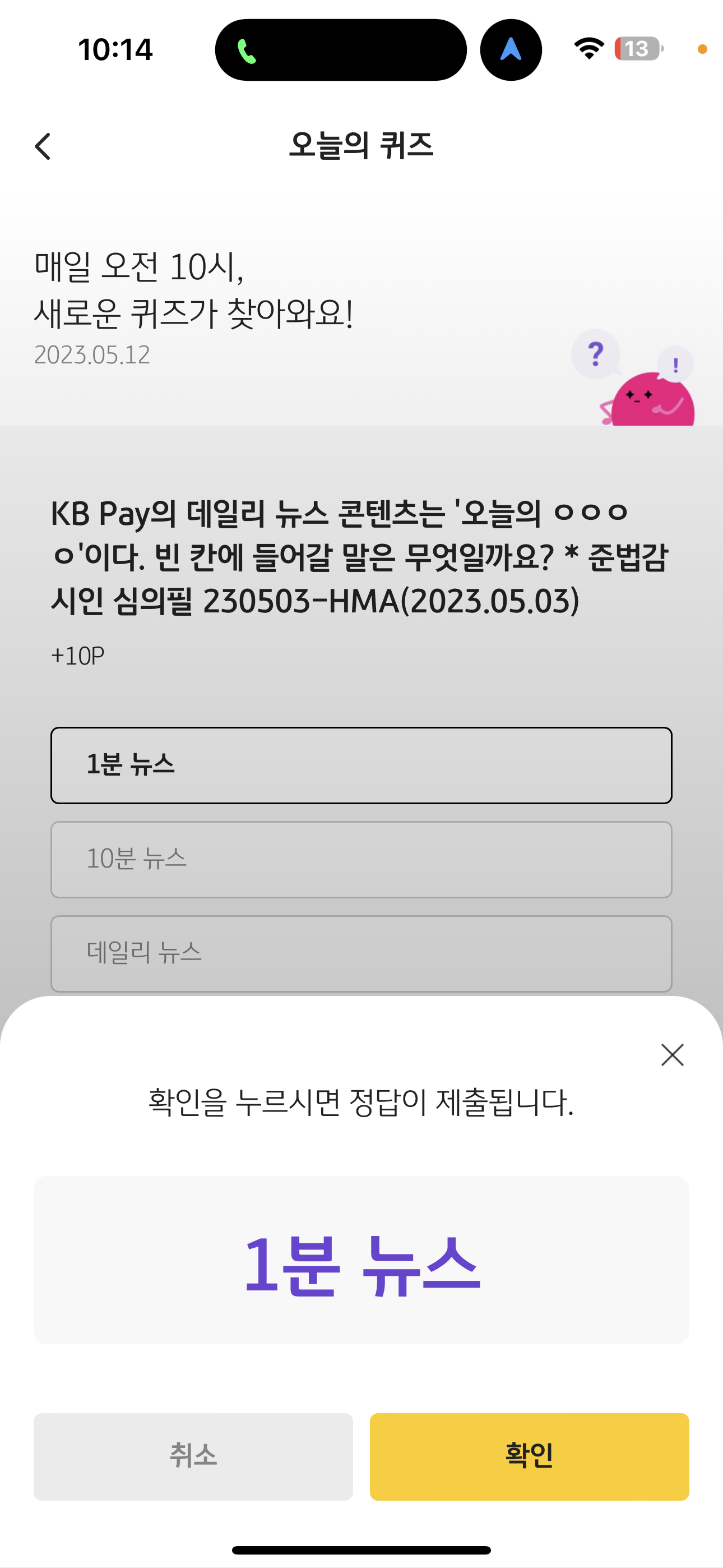 KB Pay 오늘의 퀴즈 정답은 1분 뉴스 입니다.