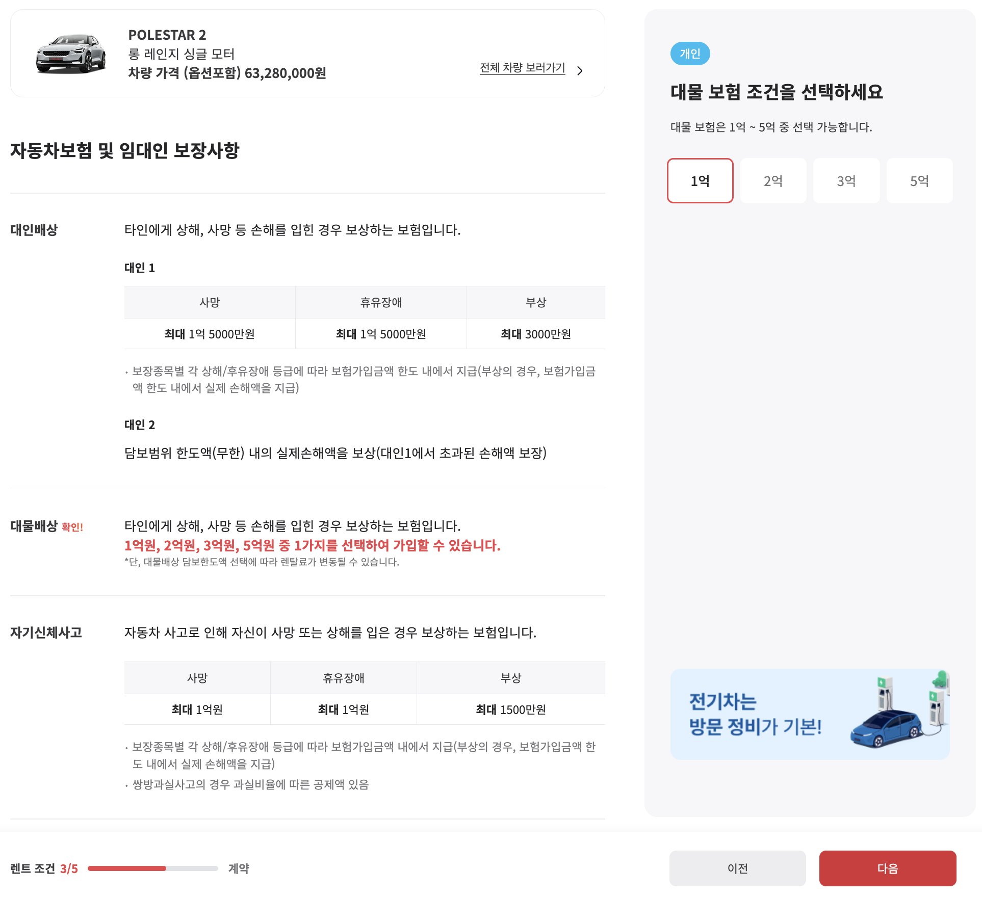 대물 보험 조건을 선택하게 나옵니다. 그냥 1억만 선택해 봤습니다. 하지만 요즘은 고가 차량도 많으니 운전을 많이 하신다면 5억을 선택하는게 좋지 않을까 합니다