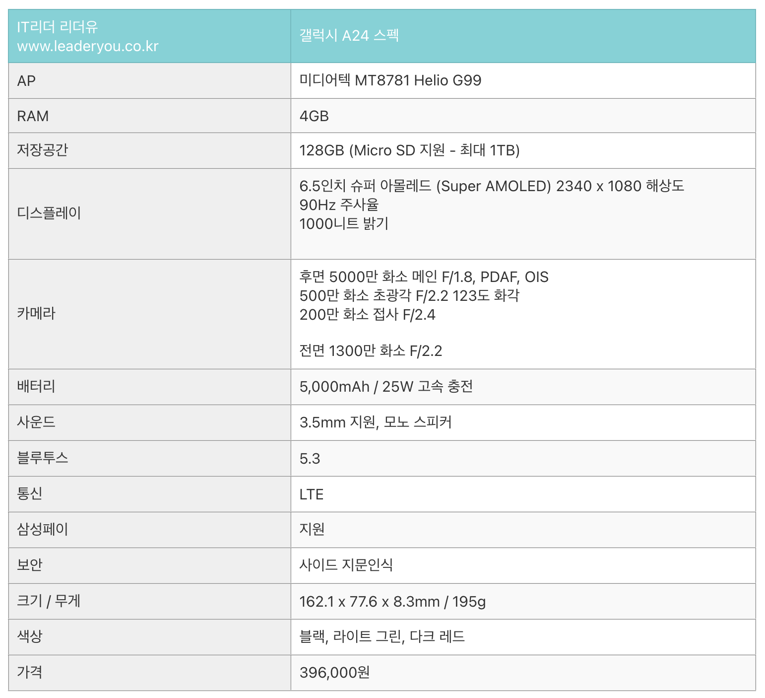 다만 아쉬운점은 RAM이 4GB로 작다는 것이고 가격이 갤럭시 A24 스펙에 비해 상대적으로 비싸다는 것입니다. 중국산 스마트폰의 경우 이 가격이면 더 좋은 스펙 선택이 가능해 이 점은 고려해서 선택하시면 될 것 같습니다.