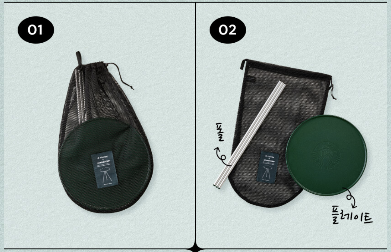 2023 여름 스타벅스 프리퀀시 스타벅스 사이드 테이블은 이렇게 휴대가 간편한 구조로 되어 있습니다. 다 분리해서 그물망에 담아다닐 수 있고 폴과 플레이트로 완전한 분리를 할 수 있습니다.