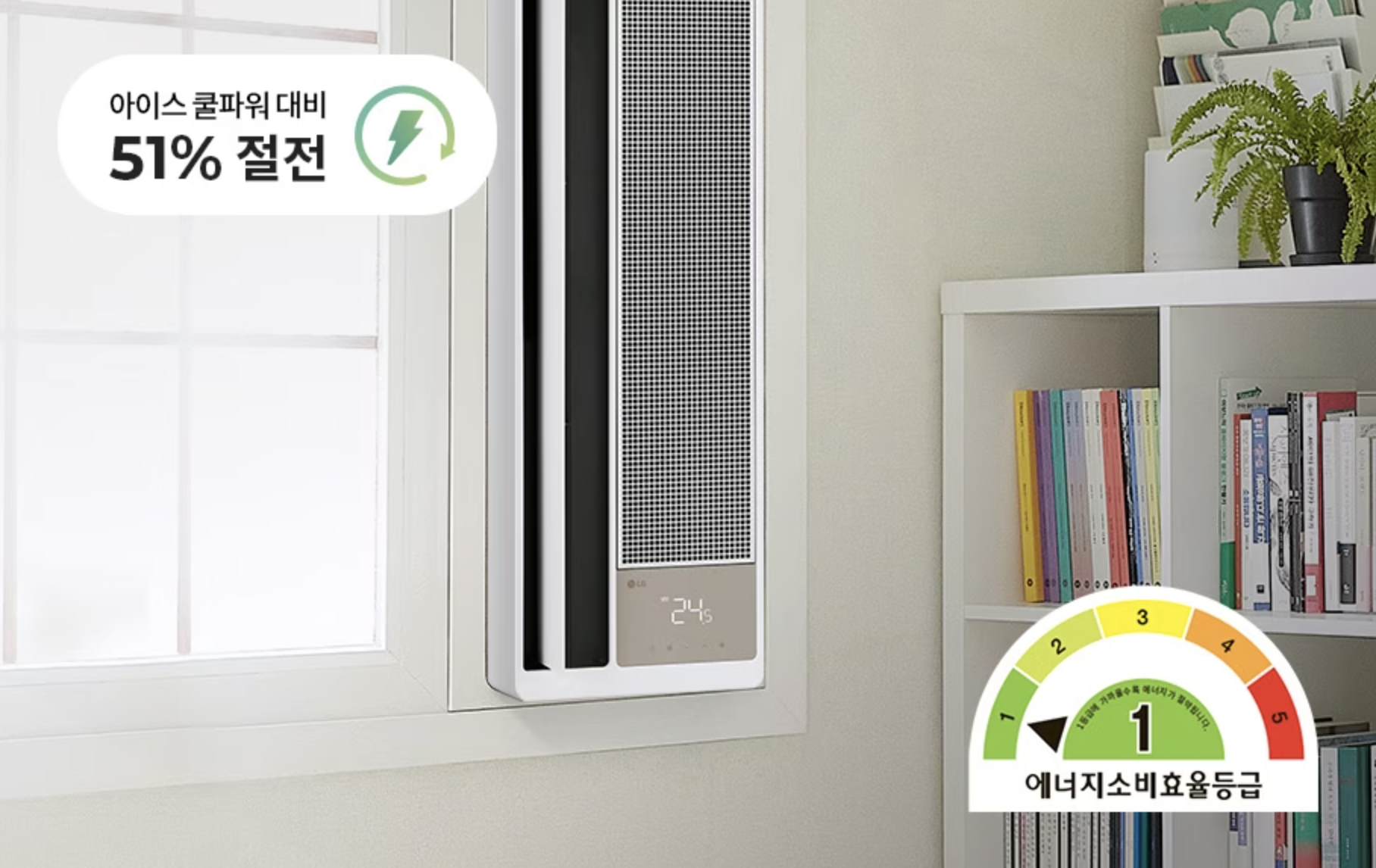 LG 창문형 에어컨은 에너지소비효율 1등급 제품입니다. 듀얼 인버터 컴프레서를 탑재해 냉방 성능도 좋으면서 에너지 효율이 뛰어나 만족스럽게 사용할 수 있습니다.