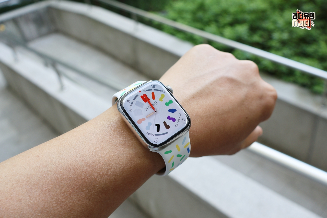 애플워치8 스테인리스 스틸 실버와 프라이드 에디션 스포츠밴드 조합