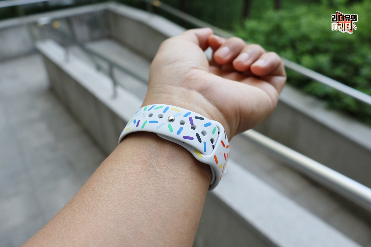 애플워치 스포츠밴드가 체결된 안쪽 모습입니다. 거친 움직임에도 쉽게 애플워치 시계줄(애플워치 스트랩)이 분리되지 않도록 설계되어 있습니다.
