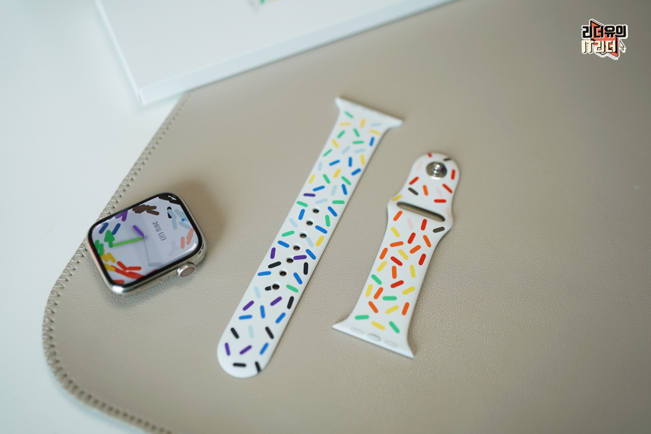 애플워치8 스테인리스 스틸 실버와 프라이드 에디션 스포츠밴드 조합