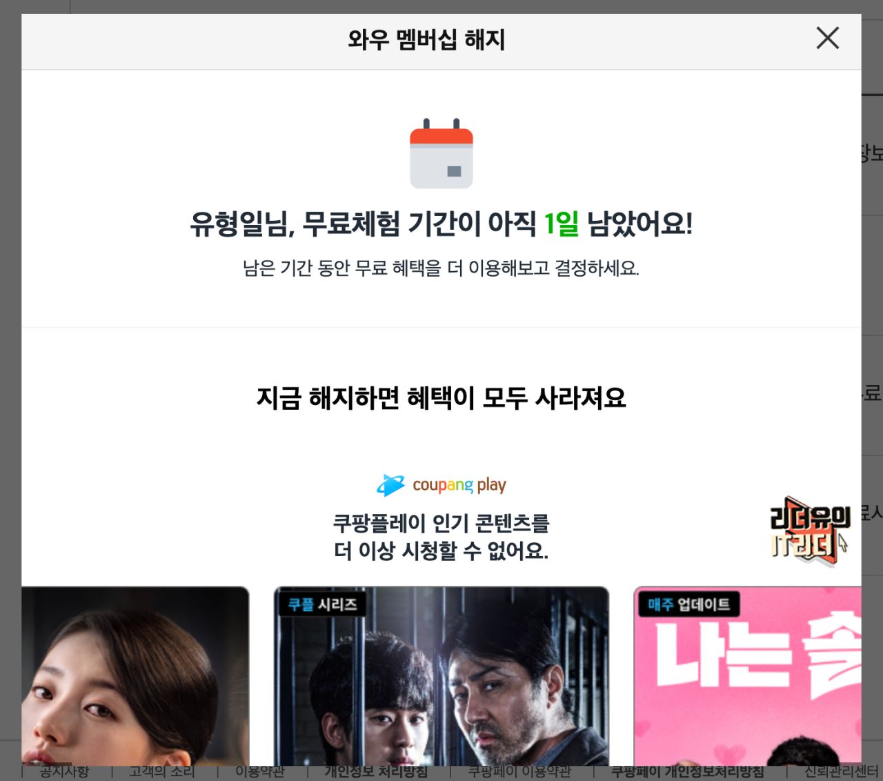 쿠팡 와우 멤버십 해지하기를 누르면 와우 멤버십 무료체험 중인 분들은 얼마나 남았는지 보여주고 있습니다.