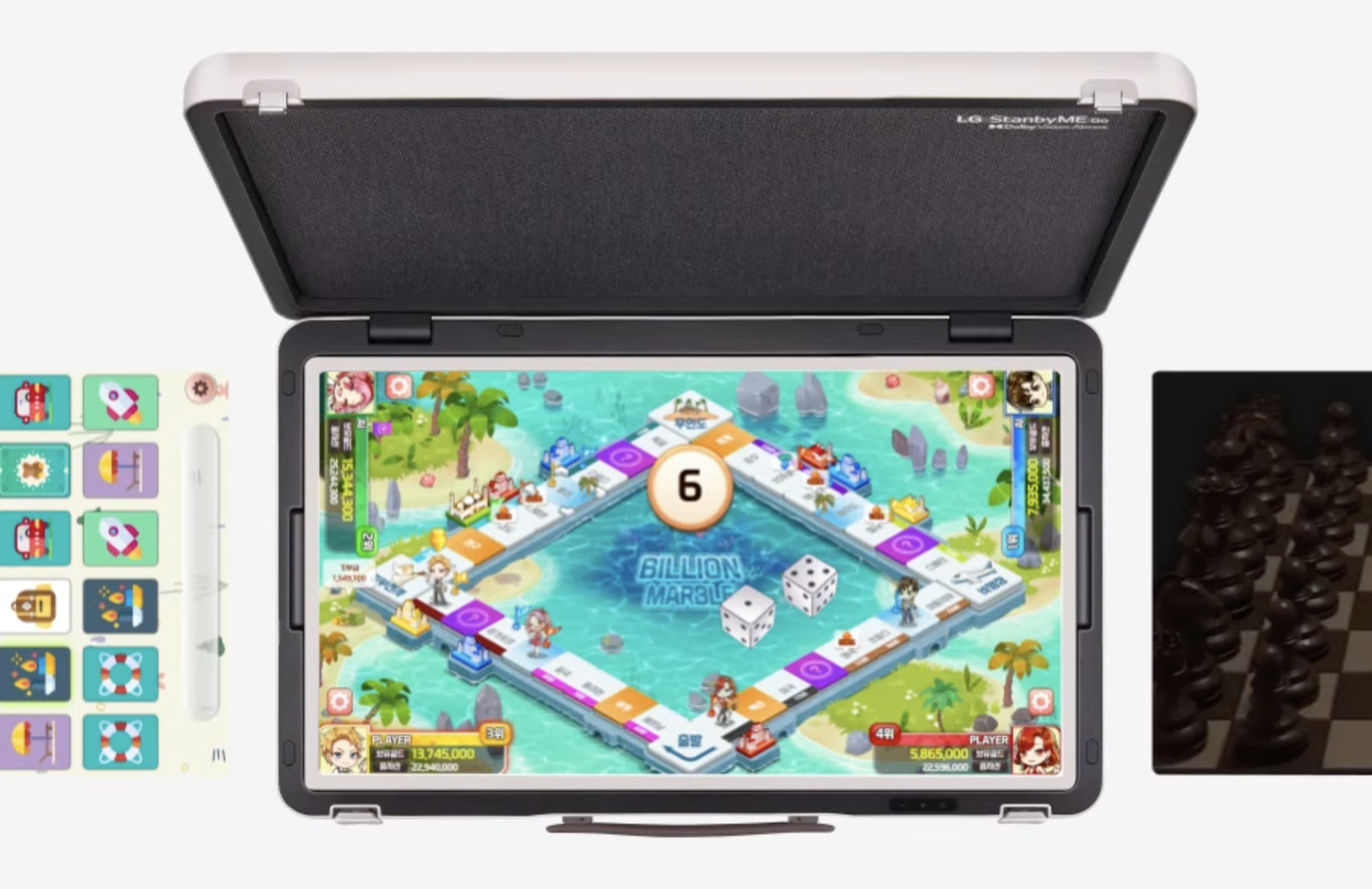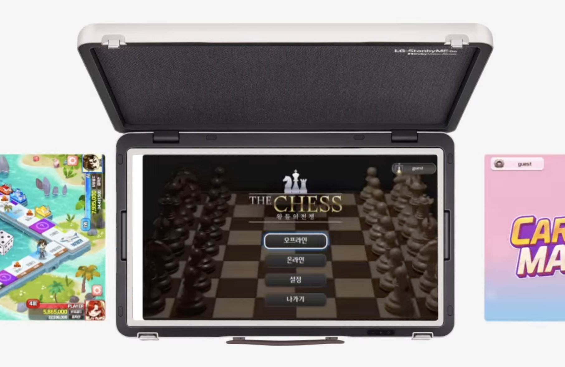 LG 스탠바이미 GO는 화면을 눕혀서 사용하는 테이블 모드를 지원하고 테이블 모드에 특화된 게임과 테마 스킨을 탑재하고 있습니다. 예를 들어 화면을 터치해서 사용할 수 있는 체스, 틀린그림 찾기 등을 눕혀서 사용하는 것입니다.