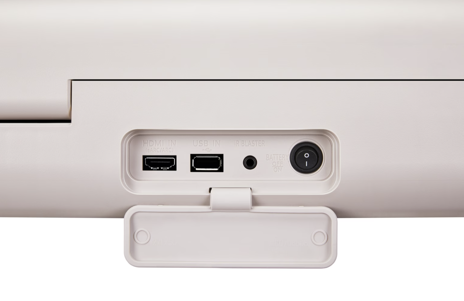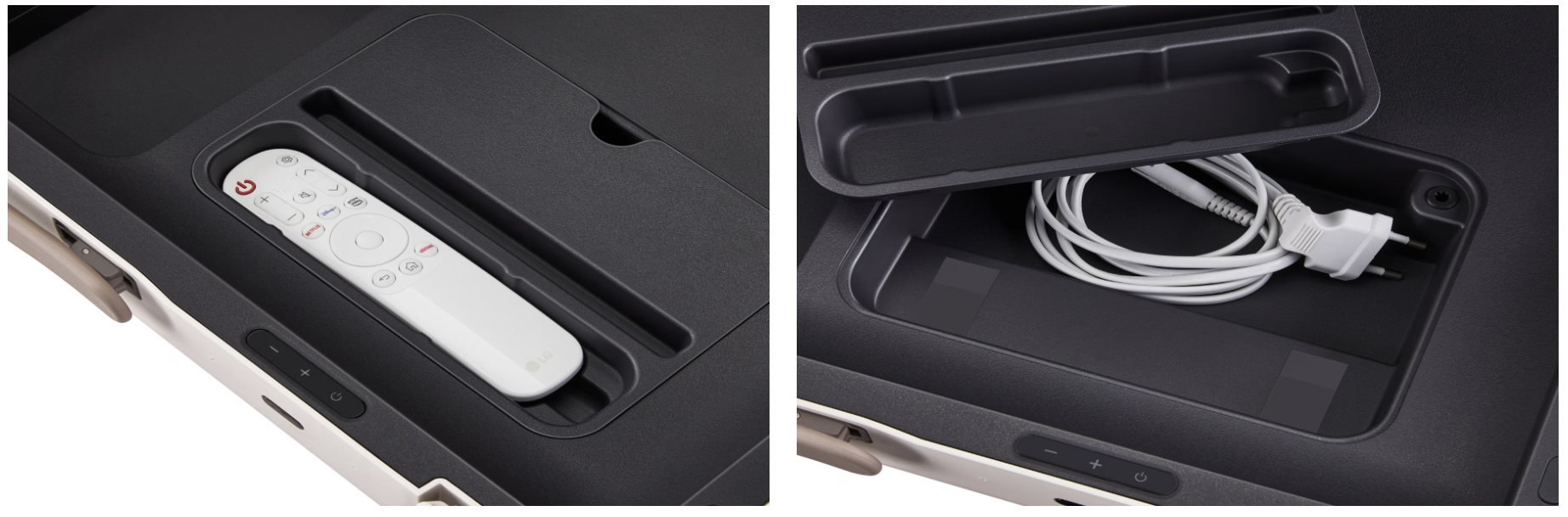내부에 리모컨, 전원 케이블 액세서리를 보관할 수 있고 내장 배터리를 탑재해 전원 연결 없이 최장 3시간 동안 사용이 가능하게 했습니다.
