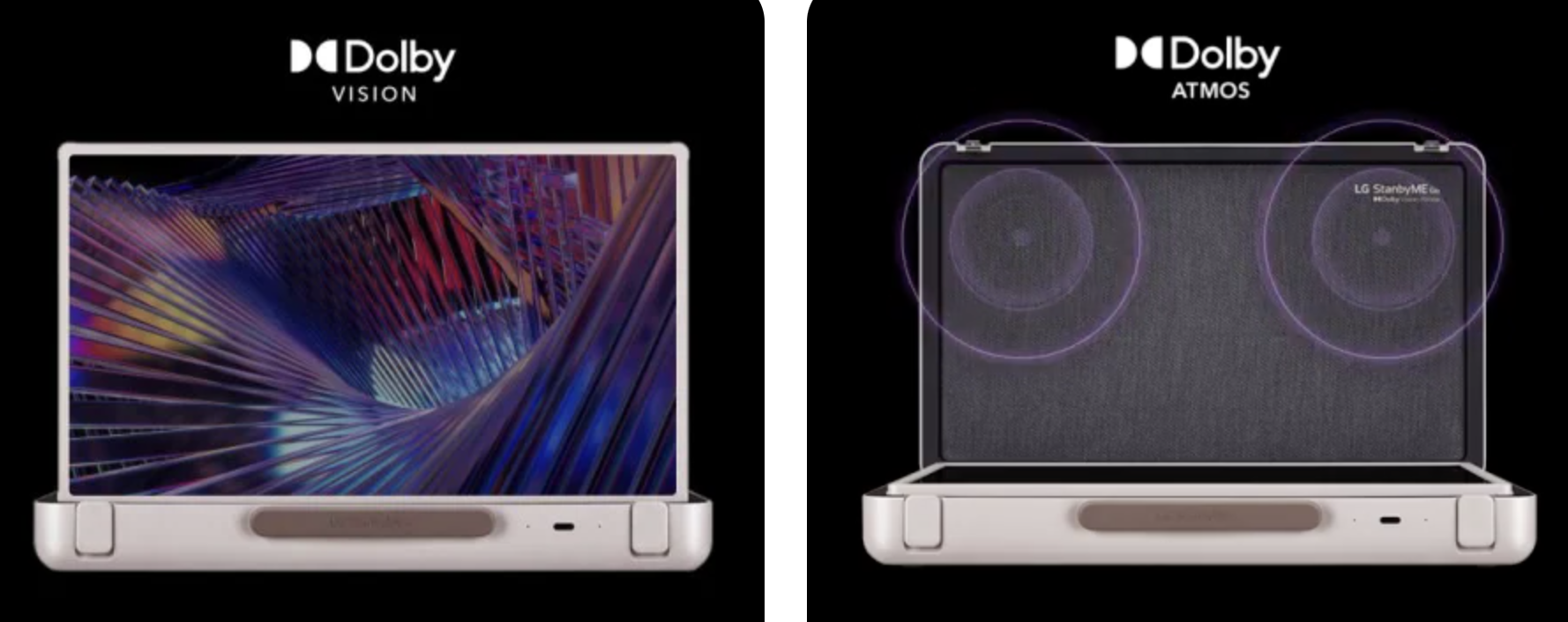 LG 스탠바이미 GO는 20W 4채널 스피커를 탑재해 풍부한 소리를 들을 수 있게 했습니다. 돌비비전, 돌비애트모스를 지원해 입체감있는 영상과 사운드 감상이 가능합니다.