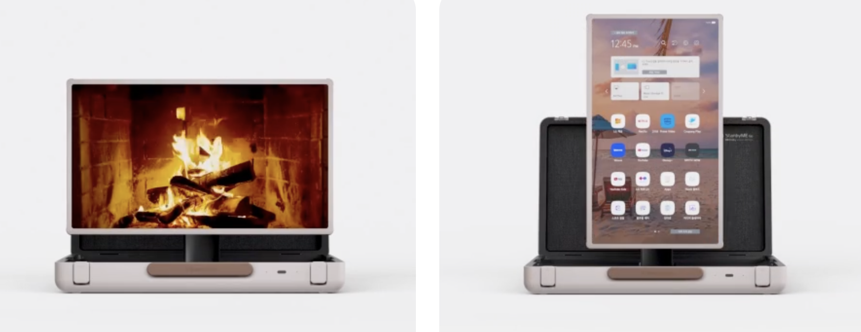 LG 스탠바이미 GO는 단순히 TV를 안에 넣은게 아닌 태블릿PC 처럼 케이스를 열면 자동으로 화면이 켜지고 케이스를 닫으면 화면이 꺼지는 장치가 탑재되어 있습니다.