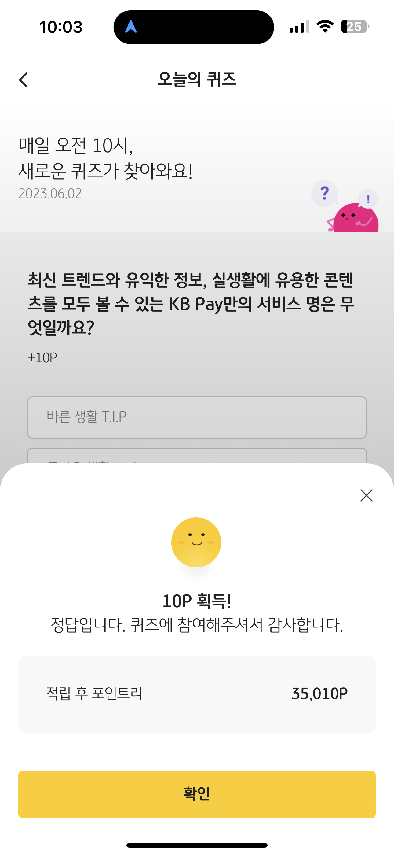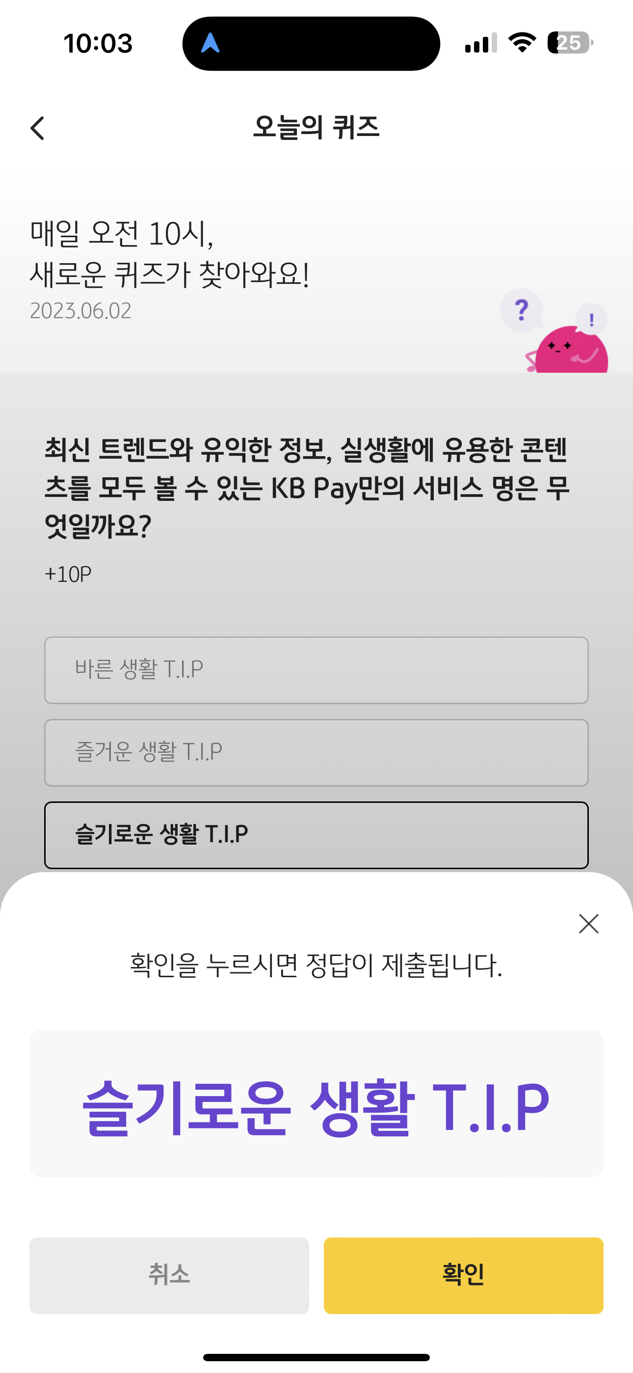 KB Pay 오늘의 퀴즈 정답은 슬기로운 생활 T.I.P 입니다