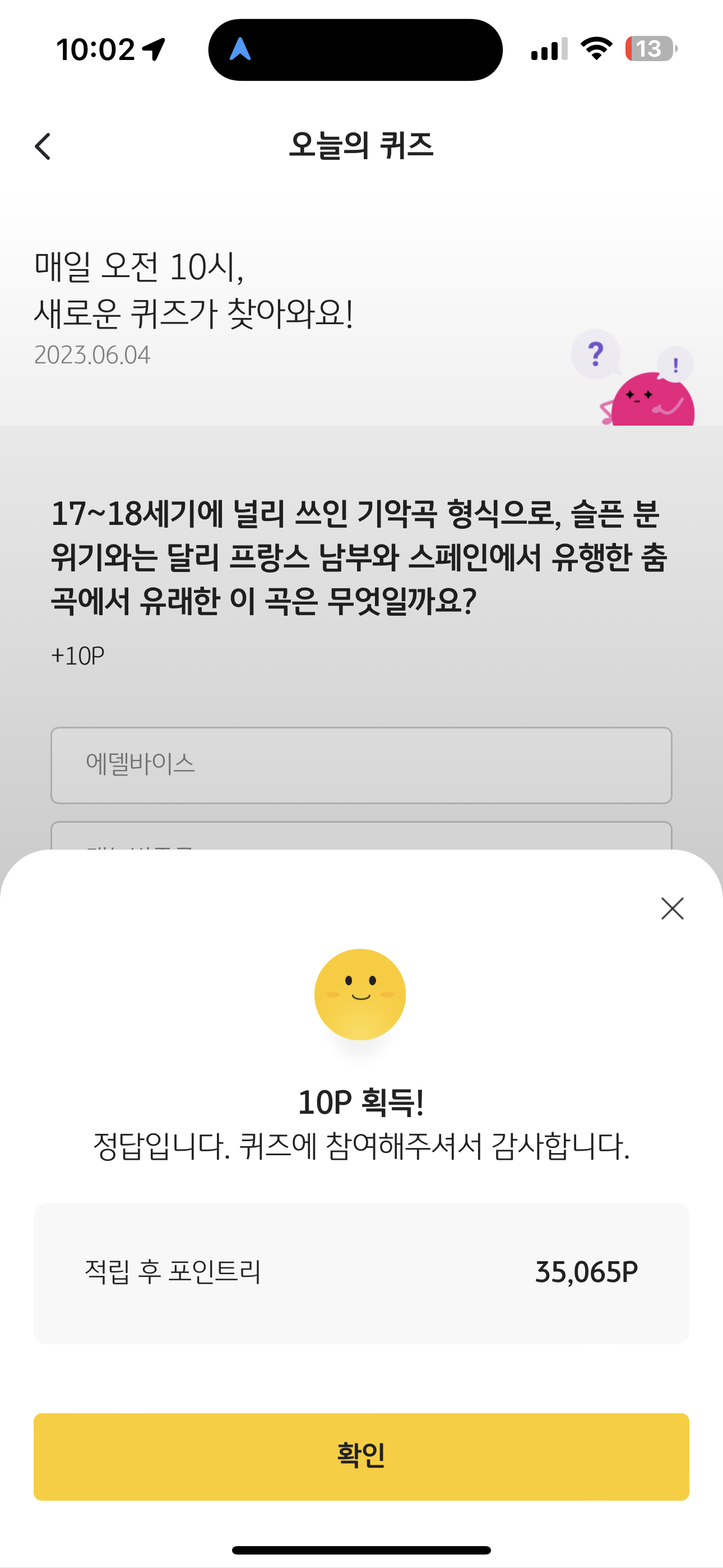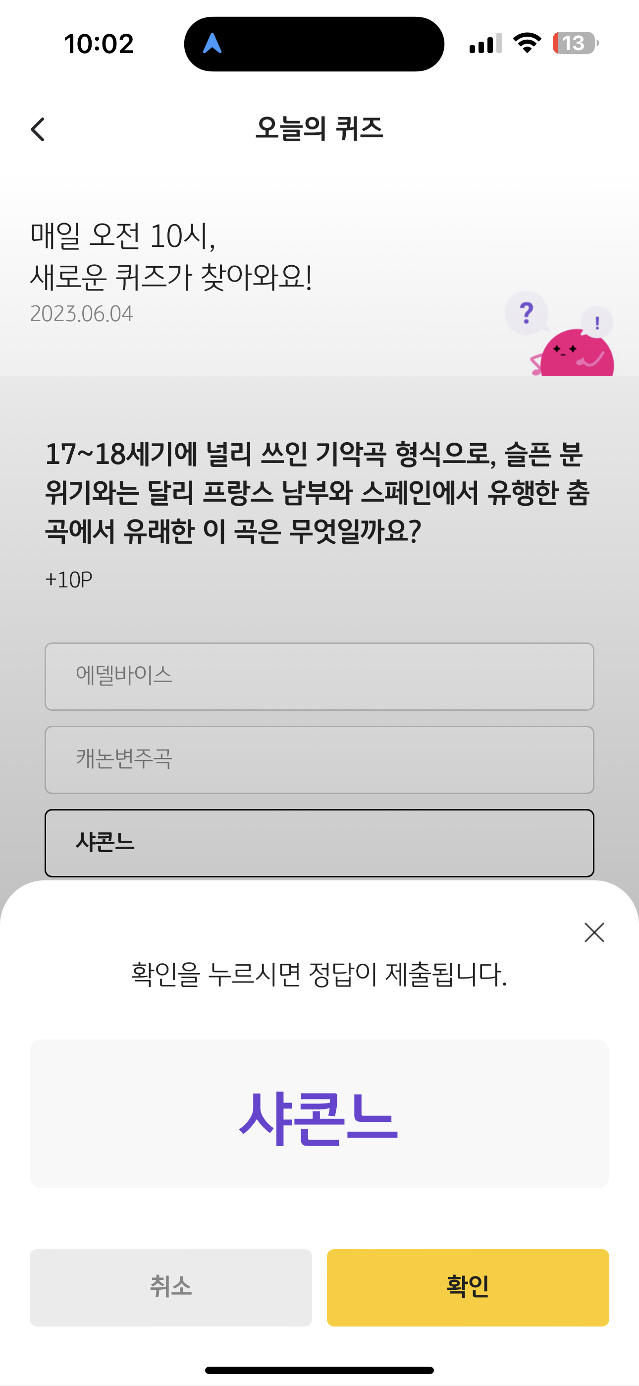 KB Pay 오늘의 퀴즈 정답은 샤콘느 입니다