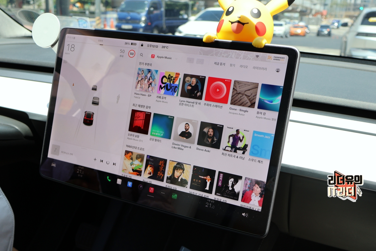 테슬라 모델Y 실내에서 보는 애플뮤직 화면입니다. 아이패드나 PC에서 들어가는 애플뮤직 화면과 비슷하게 구성되어 있습니다. 다만 인기 추천곡의 경우 PC나 아이패드 같은 경우는 앨범 아트가 좀 더 크게 디자인 되어 있는데 테슬라 애플뮤직은 앨범아트 크기가 전체적으로 일정하게 디자인 되어 있습니다.