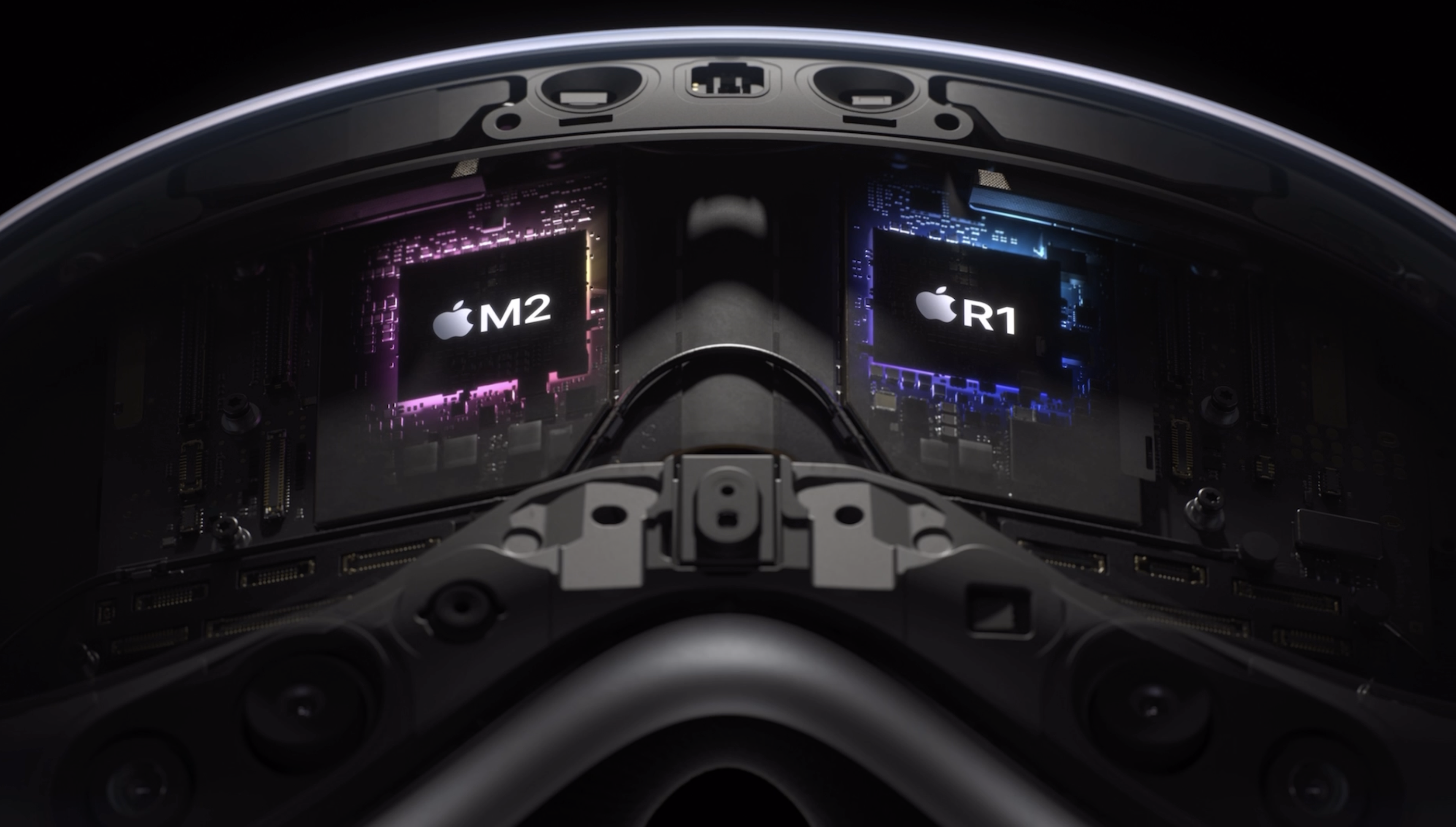 애플 비전 프로는 단순히 화면을 보여주는 글라스가 아닌 자체적인 컴퓨터로서의 역할에 집중했습니다. 빠른 컴퓨팅 성능을 위해 애플 M2 칩을 탑재했고 애플 비전 프로만의 새로운 R1칩을 탑재해 12개의 카메라, 5개의 센서, 6개의 마이크가 주는 다양한 정보를 빠르게 처리하게 됩니다. 새로운 애플 R1칩은 눈을 한번 깜박이는 시간보다 8배 빠른 12밀리초 안에 새로운 이미지를 화면에 스트리밍해 눈에서 보이는 피로감을 없앴습니다.