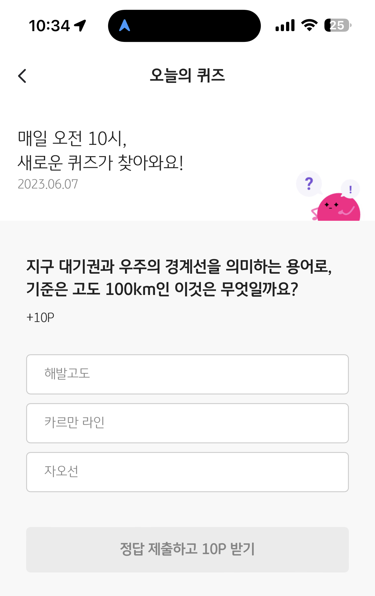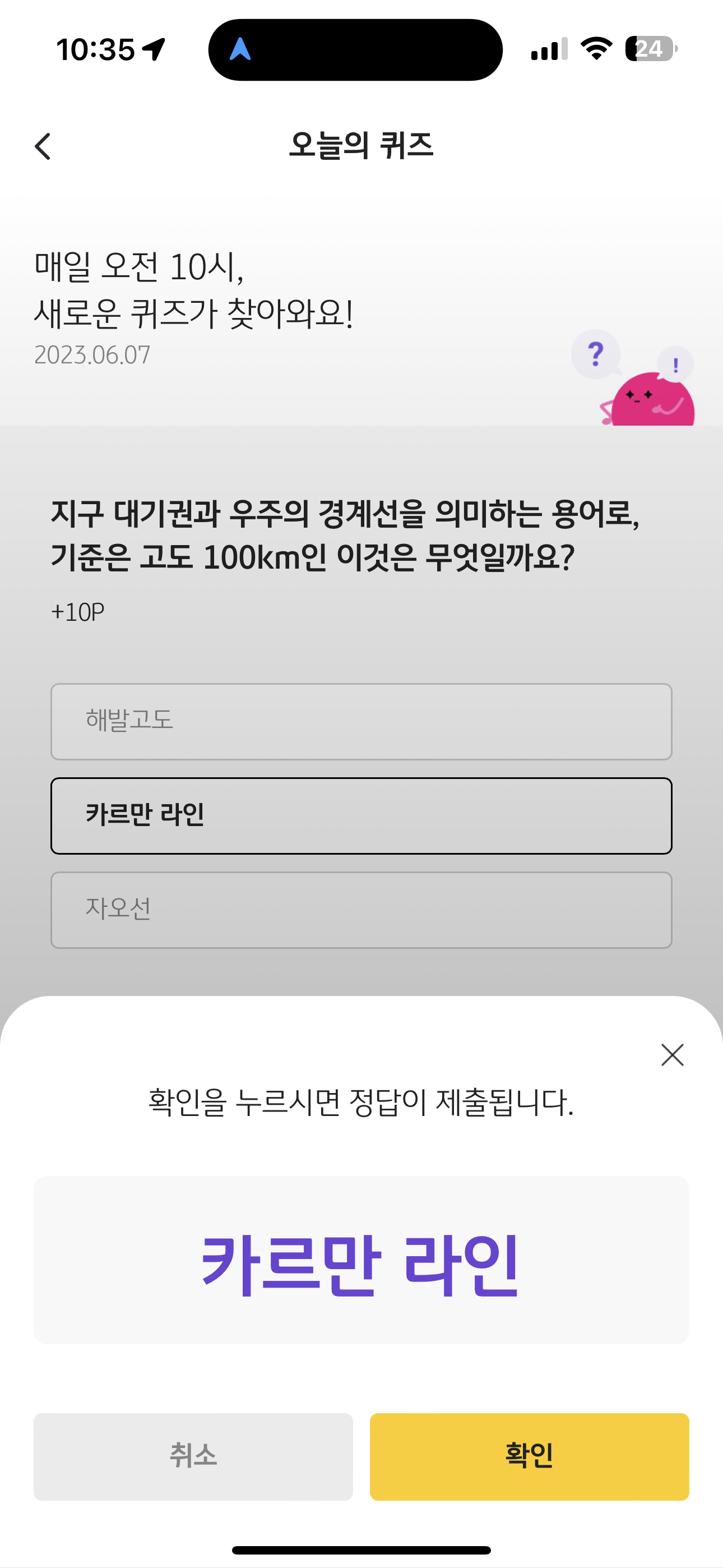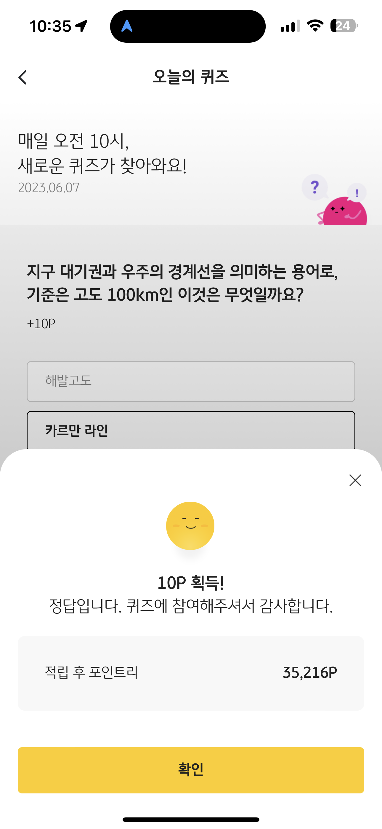 KB Pay 오늘의 퀴즈 정답은 카르만 라인 입니다