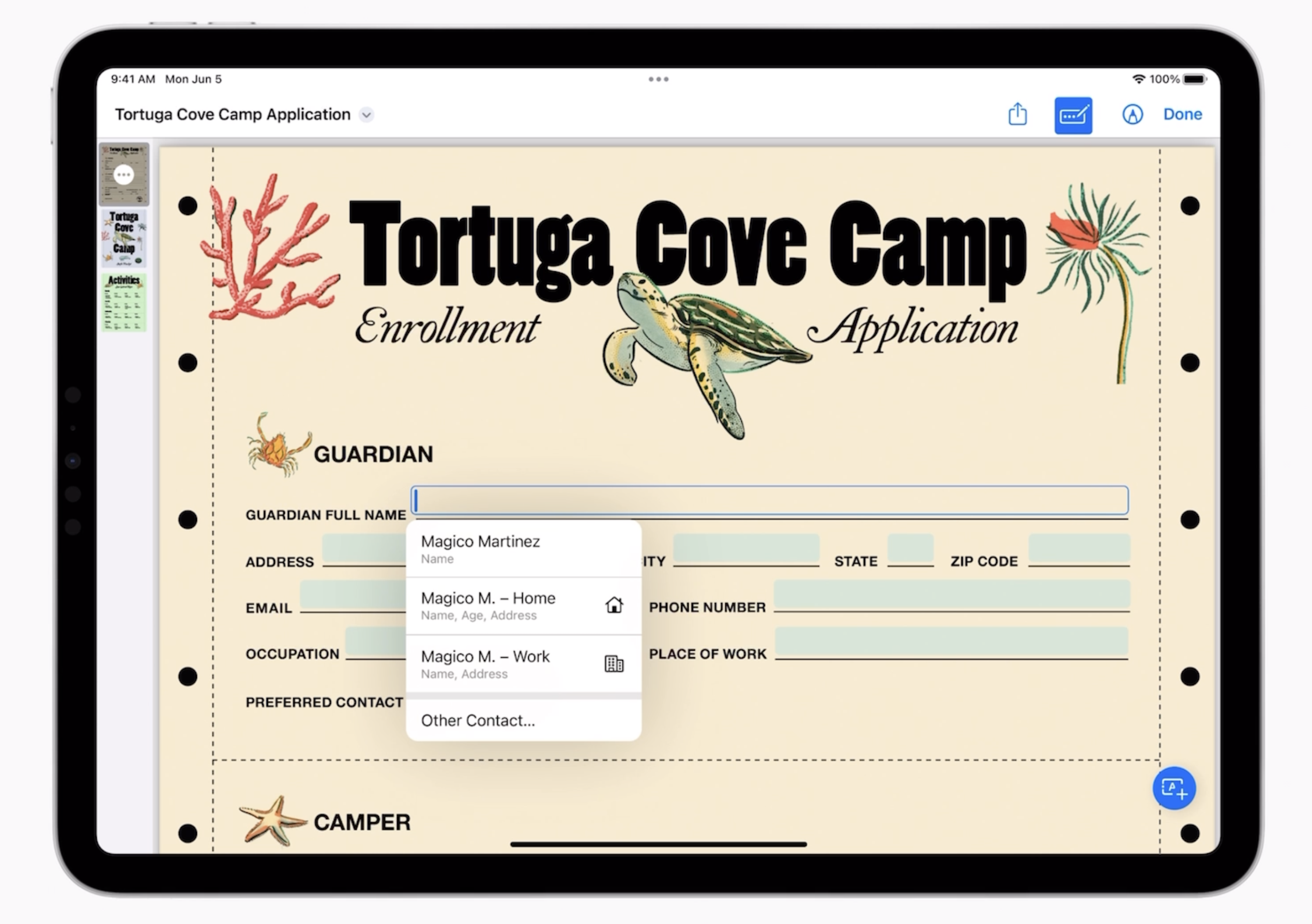 아이패드 iPadOS17에서는 PDF 활용도가 좋아졌습니다. PDF의 필드를 인식해 사용자가 이름, 주소, 이메일 등의 세부 정보를 쉽게 입력할 수 있습니다.
