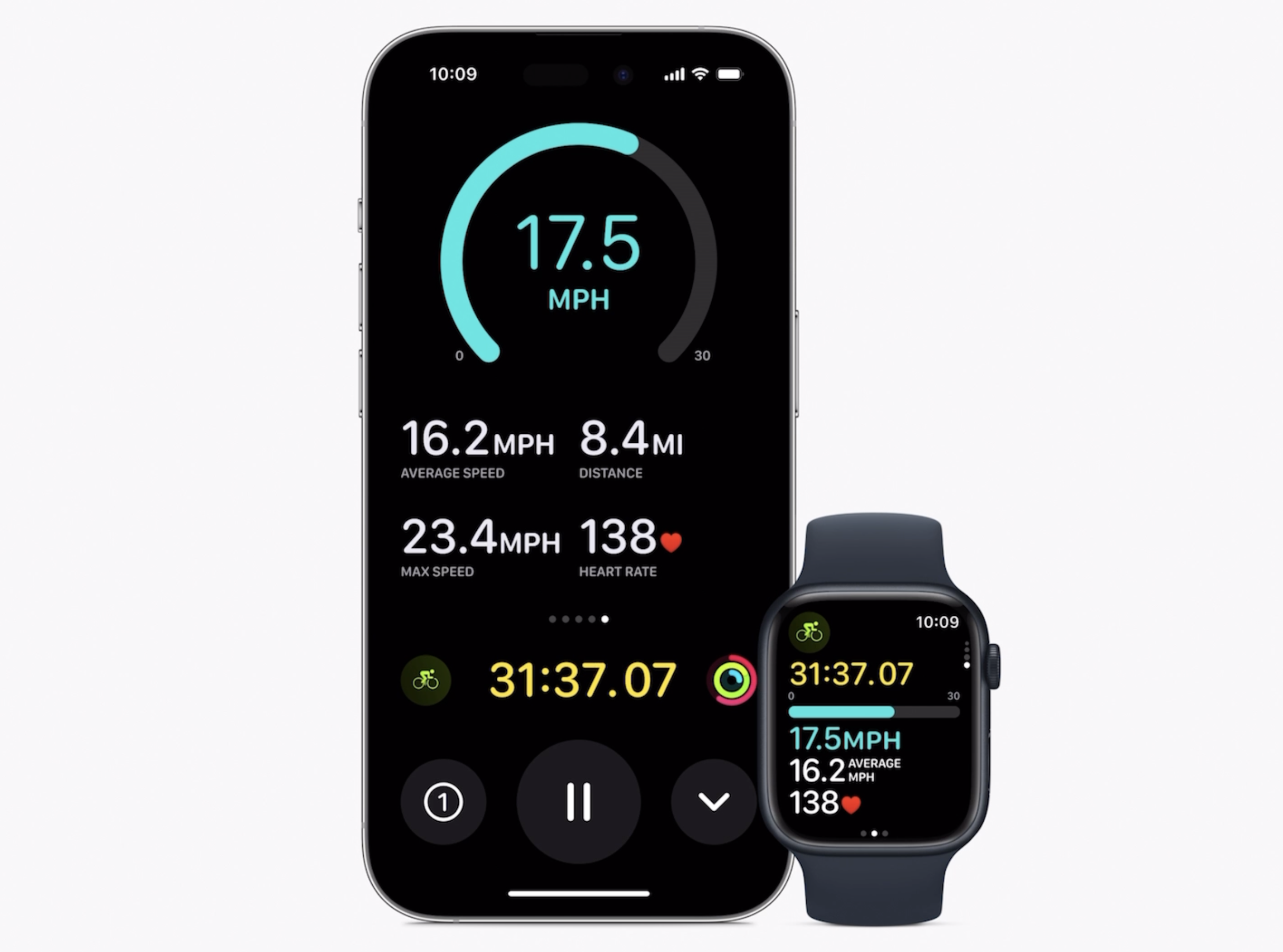 애플워치 watchOS10에서는 사이클링 운동을 시작하면 자동으로 아이폰에 실시간 현황으로 표시가 됩니다. 탭하면 화면 전체에 정보를 표시하는 변화를 볼 수 있습니다. 그리고 심박수 영역, 고도, 특정 경로 기록 경주, 사용자 설정 운동, 새로운 사이클링 속도 보기와 같은 운동 현황을 아이폰의 디스플레이 크기에 알맞게 최적화되어 볼 수 있습니다.