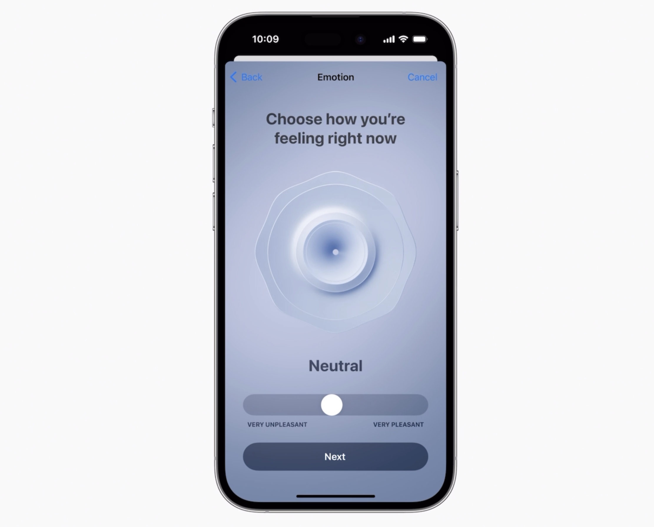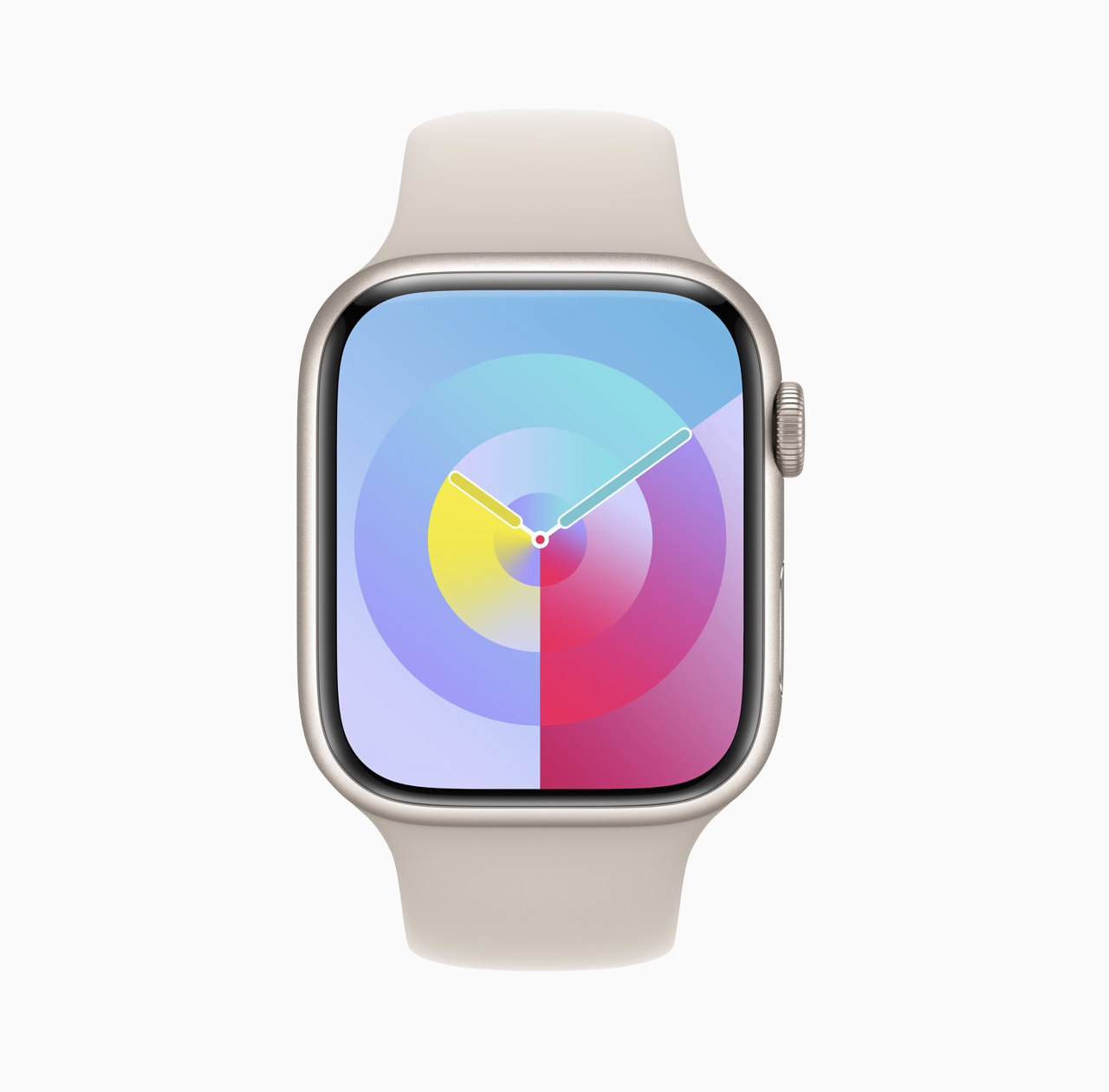애플워치 watchOS10에서는 정신건강을 지킬 수 있는 기능이 들어갔습니다. 마음 챙기기 앱으로 사용자는 순간의 감정 인신력과 회복력을 높이는 데 도움을 받을 수 있습니다. 디지털 크라운을 돌려 다양한 모양들을 스크롤해 자신의 기분을 표현할 수 있고 감정에 가장 큰 영향을 끼치는 것이 무엇인지 선택하고 기분을 자세히 묘사할 수 있습니다.