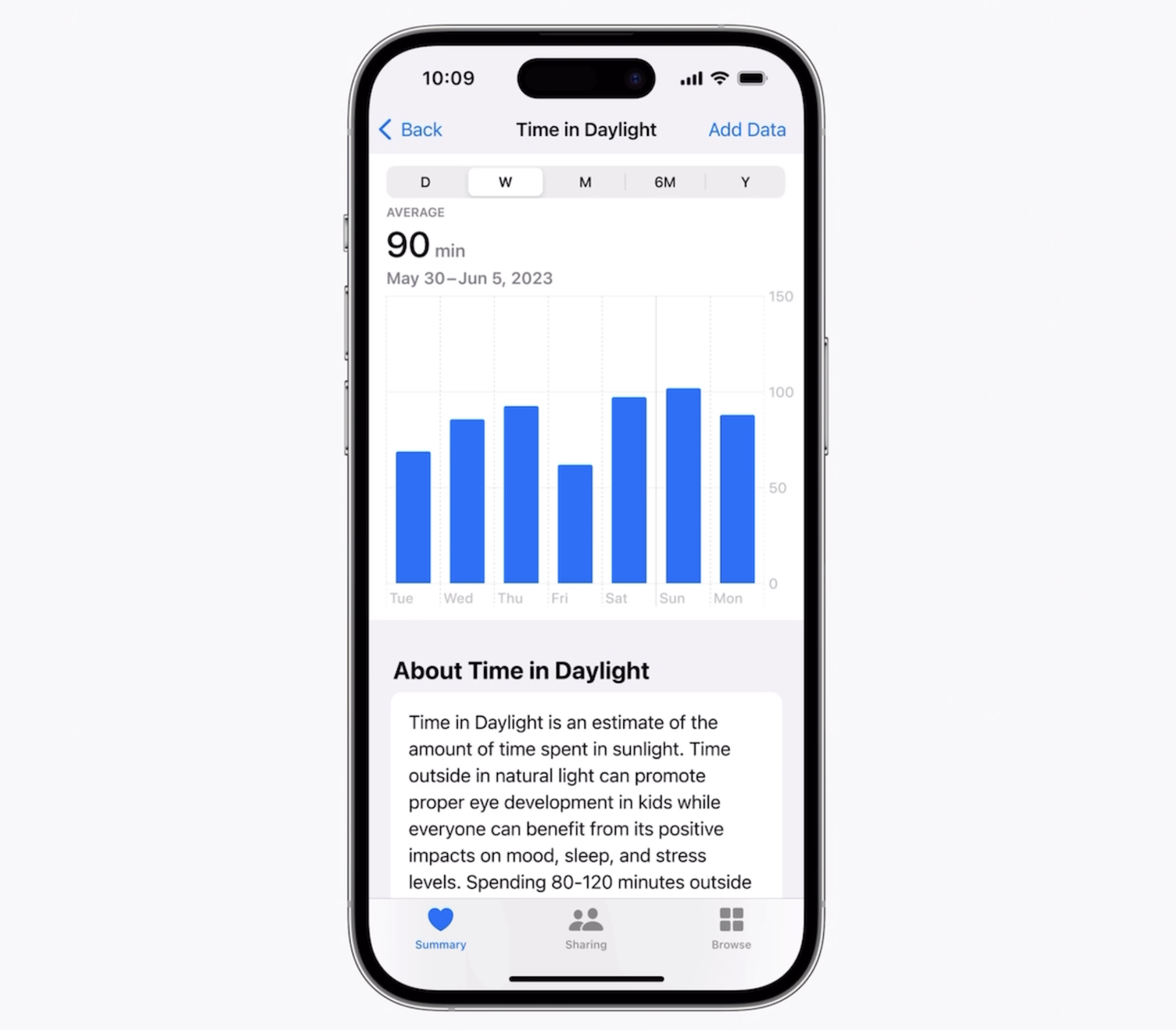 애플워치 watchOS10에서는 시각 건강을 지킬 수 있는 변화가 생겼습니다. 근시는 전 세계적으로 시각 건강을 해치는 주요 원인인데요. 국제근시학회는 근시의 위험을 줄기이기 위해 어린이들에게 하루에 최소 80~120분 동안 야외에서 시간을 보내기를 권장했습니다. 애플워치는 watchOS10과 함께 주변광 센서를 사용해 일광 시간을 측정하는 기능을 지원하게 되는데요. 이 정보를 아이폰, 아이패드의 건강 앱에서 확인이 가능합니다.