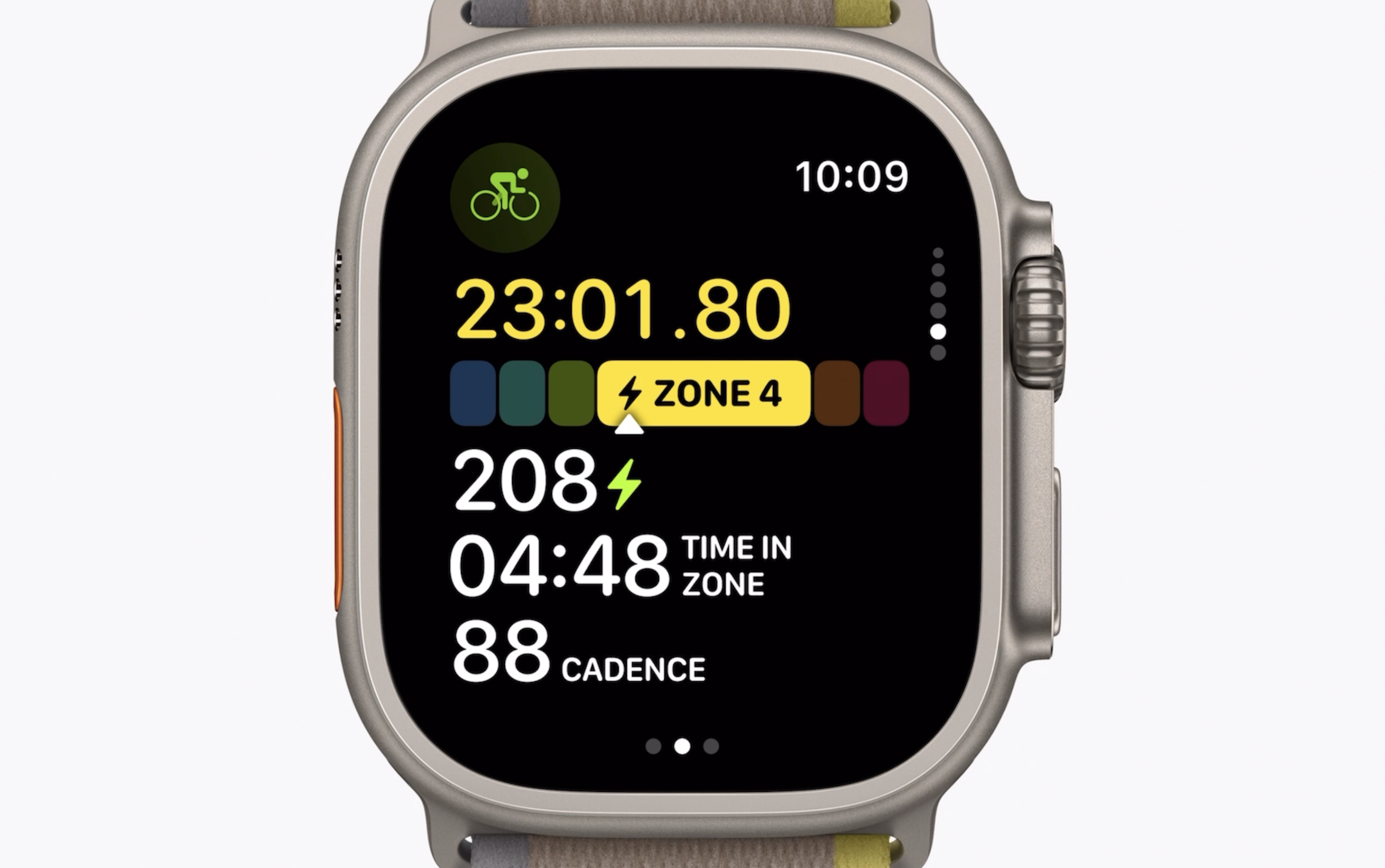 그리고 새로운 알고리즘 적용으로 애플워치와 파워 미터로 측정한 센서 데이터를 결합해 라이더가 이론상 1간 동안 유지할 수 있는 최고 수준의 사이클링 강도를 의미하는 FTP를 측정합니다. 그리고 애플워치가 현재 속한 영역을 쉽게 파악하고 각 영역에 얼마나 머물렀는지 추적하기 위해 FTP를 사용해 개인 맞춤 파워 영역을 계산합니다. 이는 운동 능력을 향상하는 효과적이고 인기 있는 방법입니다.