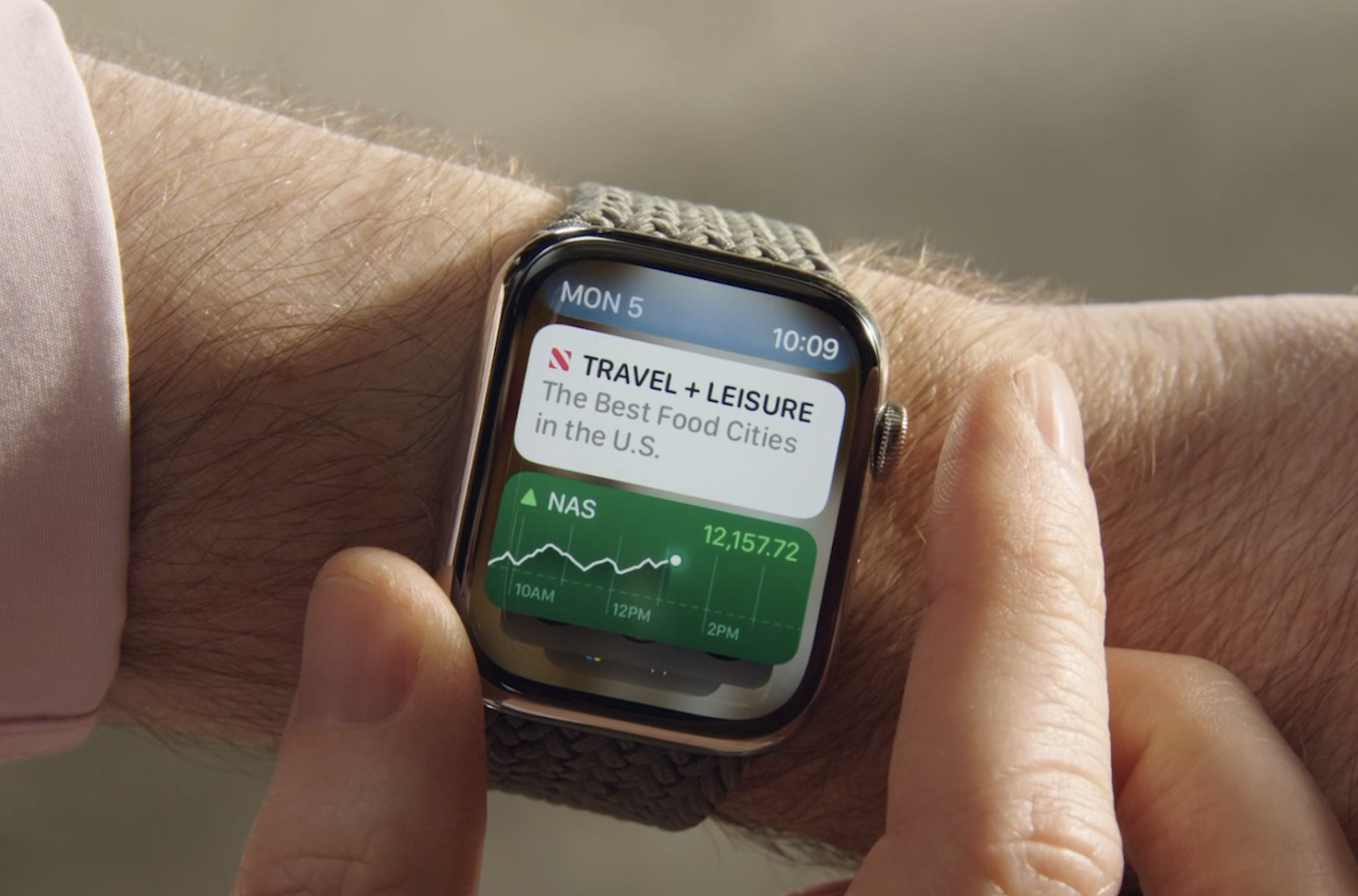 애플워치 watchOS10에서는 새롭게 디자인된 앱을 만날 수 있습니다. 더 쉽게 콘텐츠를 탐색하고 빠르게 이용할 수 있는데요. 사용자의 상황에 알맞는 정보를 보여주는 스마트 스텍을 도입해 날짜, 주식, 홈, 지도, 메시지, 세계 시계 등을 포함한 정보를 한눈에 훑어 볼 수 있게 제공합니다. 접근 방법은 디지털 크라운을 돌리면 간단하게 볼 수 있습니다. 여행 시에는 지갑앱에서 탑승권을 표시해 주고 곧 예정된 미팅이나 업무가 있으면 캘린더와 미리 알림 앱이 맨 위로 올라와서 보여집니다.