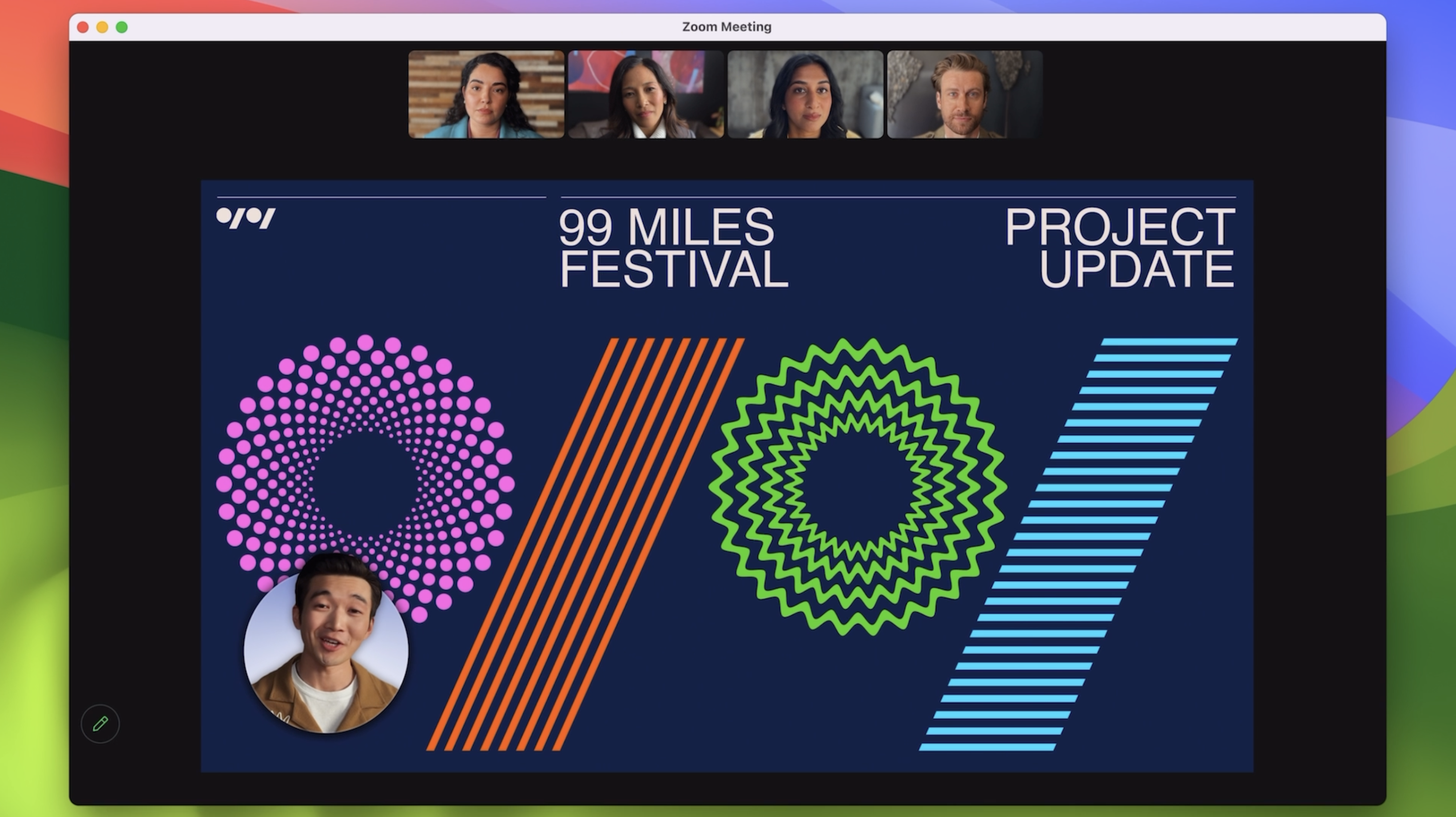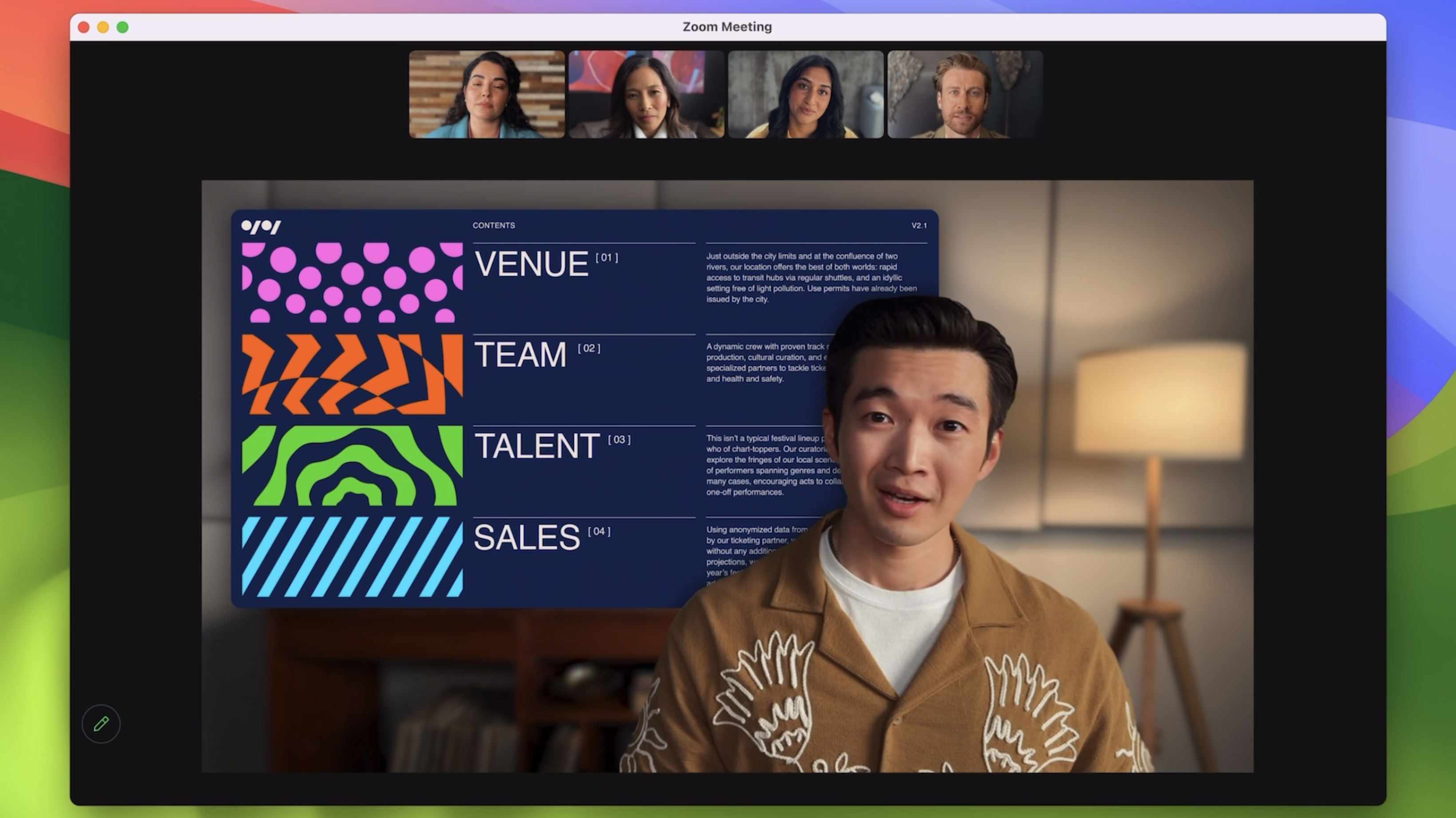macOS Sonoma (맥OS 소노마)에서는 향상된 화상 회의 기능으로 화상 회의 앱에서 작업물을 효율적으로 발표하고 공유할 수 있습니다.