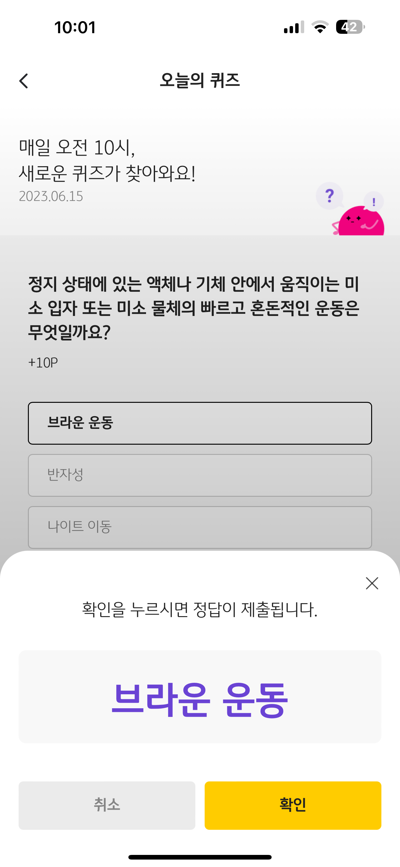 KB Pay 오늘의 퀴즈 6월 15일 정답(정지 상태에 있는 액체나 기체 안에서 움직이는 미소 입자 또는 미소 물체의 빠르고 혼돈적인 운동)