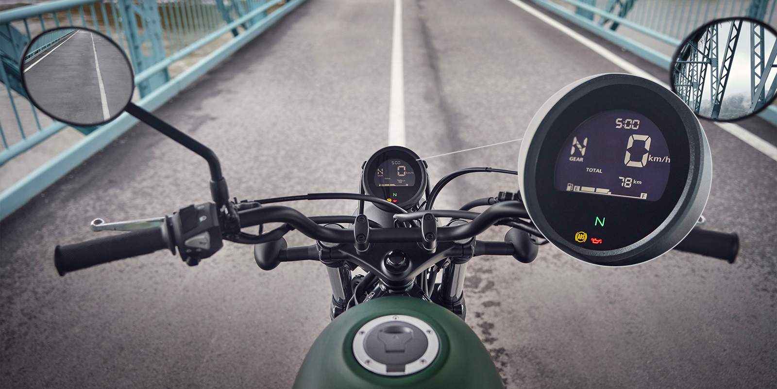혼다 CL500 스크램블러 바이크 (오토바이)는 심플한 원형의 디지털 미터를 장착했습니다. 아날로그 감성을 살리는 디자인이고 딱 필요한 정보만을 직관적으로 보여주고 있습니다.
