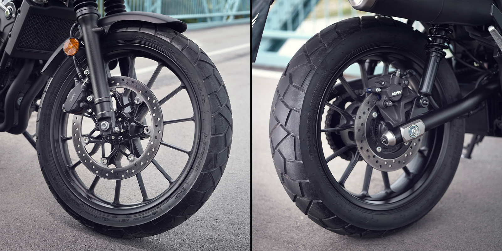혼다 CL500 스크램블러 바이크 (오토바이) 는 스크램블러라는 포지션 답게 거친 노면에서도 안정적인 주행을 할 수 있게 준비되어 있습니다. 이너 파이프 직경 41mm 정립식 텔레스코픽 프론트 포크는 150mm의 스트로크와 표준 장착의 포크 부츠로 오프로드에서 제 역할을 해낼 수 있습니다.