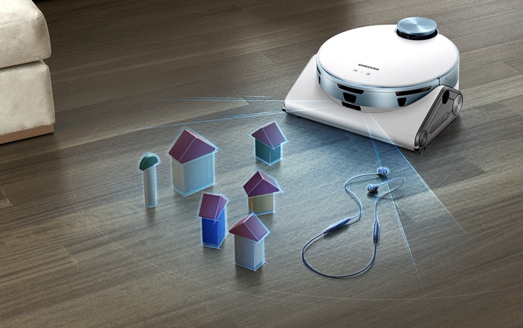 삼성 로봇청소기 비스포크 제트봇 AI 는 3D 센서를 통해 입체적으로 사물을 파악하고 라이다 센서를 통해 공간을 인식하고 있습니다.