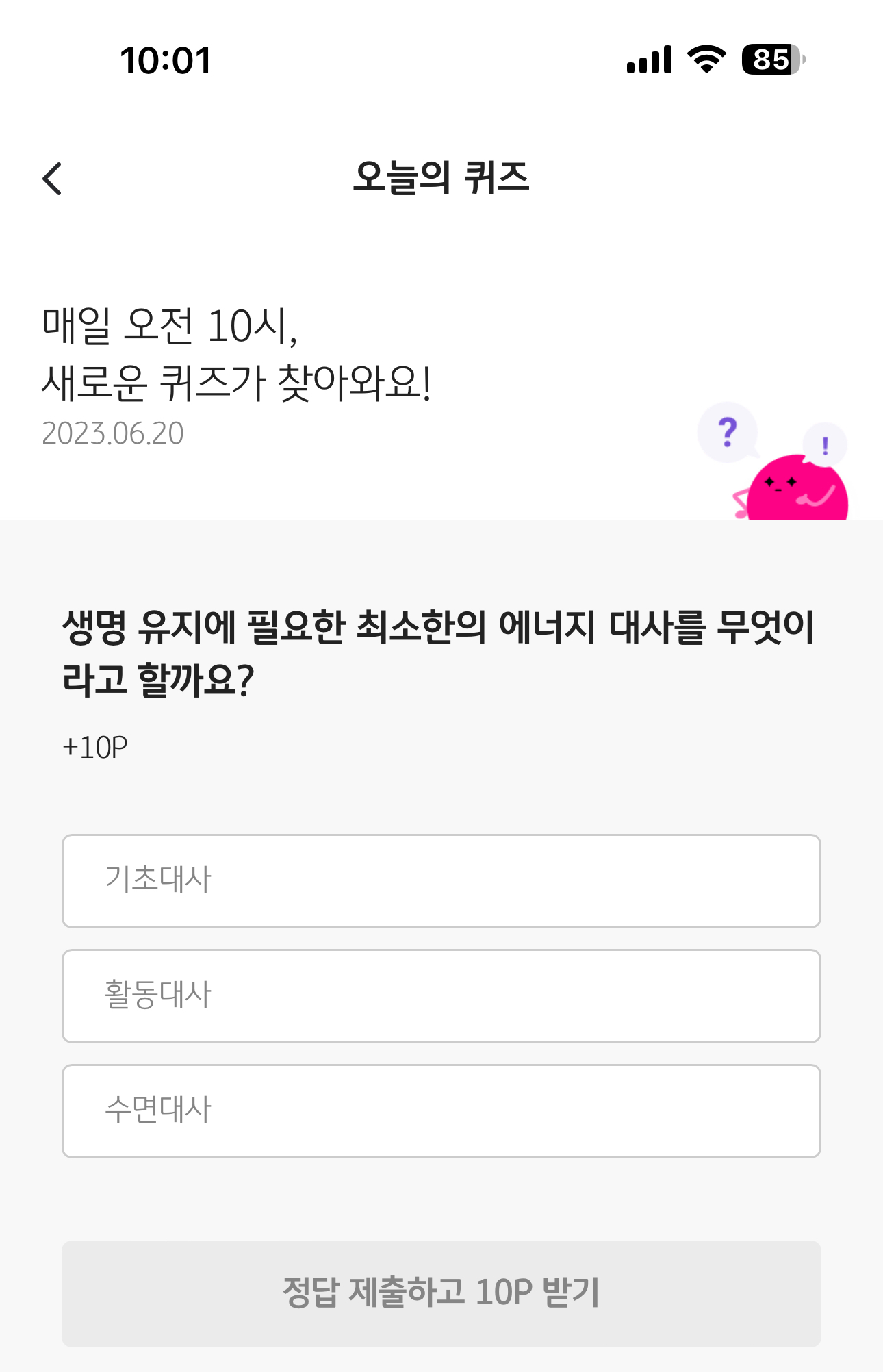 KB Pay 오늘의 퀴즈 6월 20일 정답( 생명 유지에 필요한 최소한의 에너지 대사를 무엇이라고 할까요?)