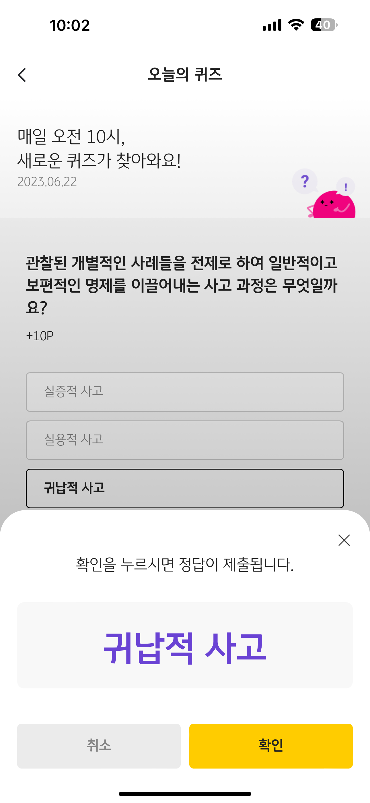 KB Pay 오늘의 퀴즈 정답은 귀납적 사고 입니다
