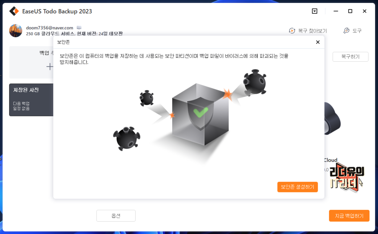 참고로 보안존은 컴퓨터의 백업을 저장하는 데 사용되는 보안 파티션입니다. 백업 파일이 바이러스에 파괴되는 것을 방지해 주는 것으로 더욱 안전하게 데이터를 보호해 주는 역할을 합니다.