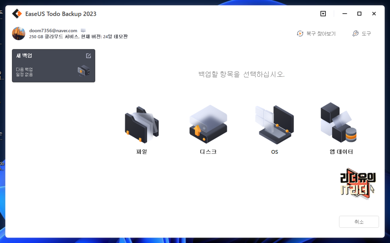 새 백업을 시작하면 백업할 항목을 선택하게 나옵니다. 파일인지, 디스크인지, OS인지, 앱 데이터인지 골라서 백업을 할 수 있게 지원합니다. 일반적인 데이터 백업 프로그램은 기본 백업만 지원하지만 이지어스 데이터 백업 프로그램 EaseUS Todo Backup 2023 은 섬세하게 백업을 구분해서 할 수 있게 해 더욱 간편하고 좋습니다.