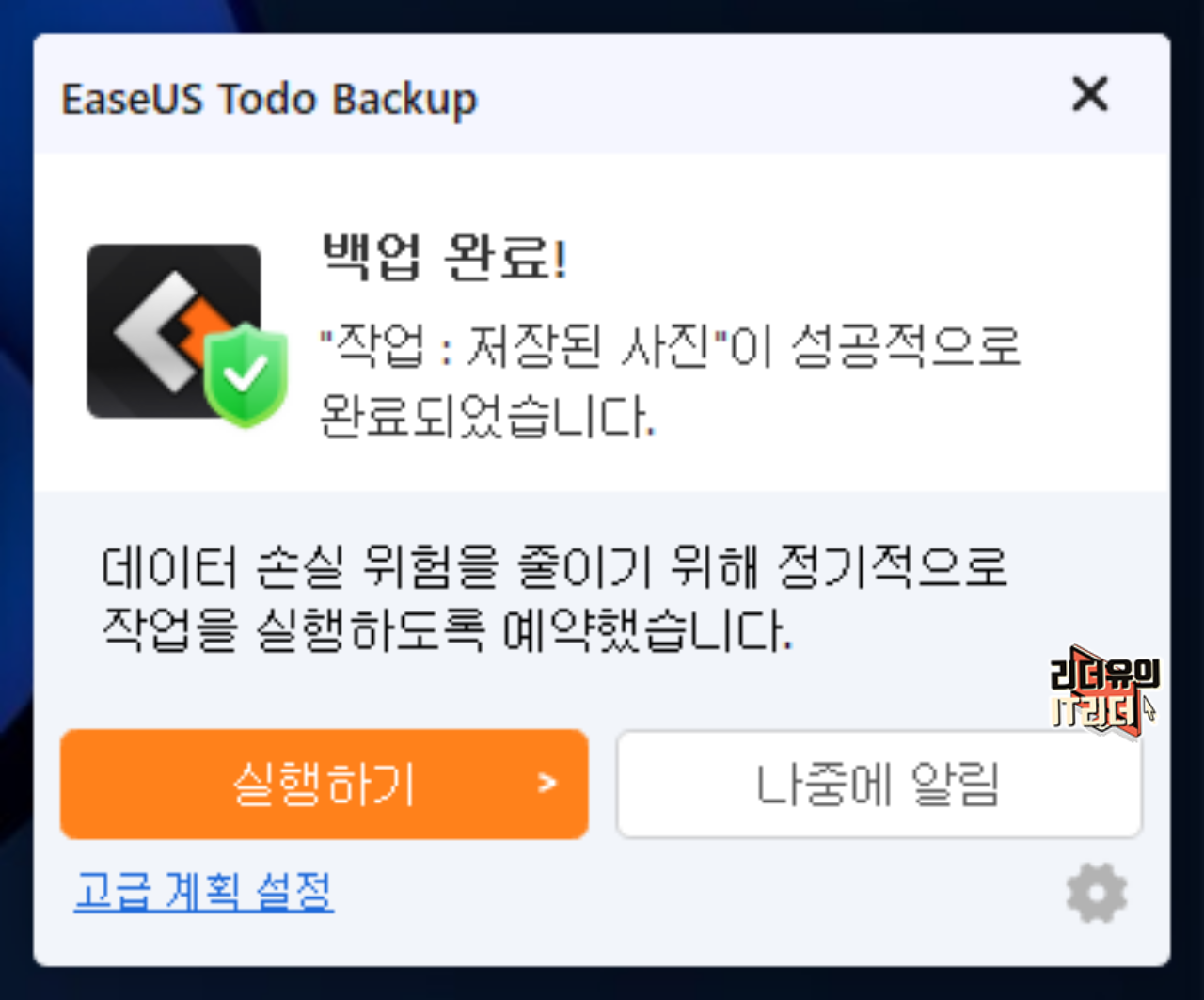 백업이 완료되면 안내 메시지가 나오고 데이터 손실 위험을 줄이기 위해 정기적으로 작업을 실행할 수 있게 예약을 할 수 있습니다.