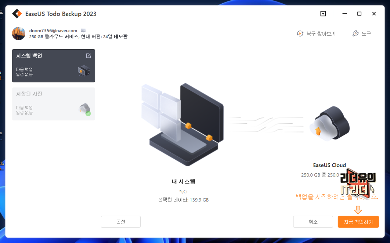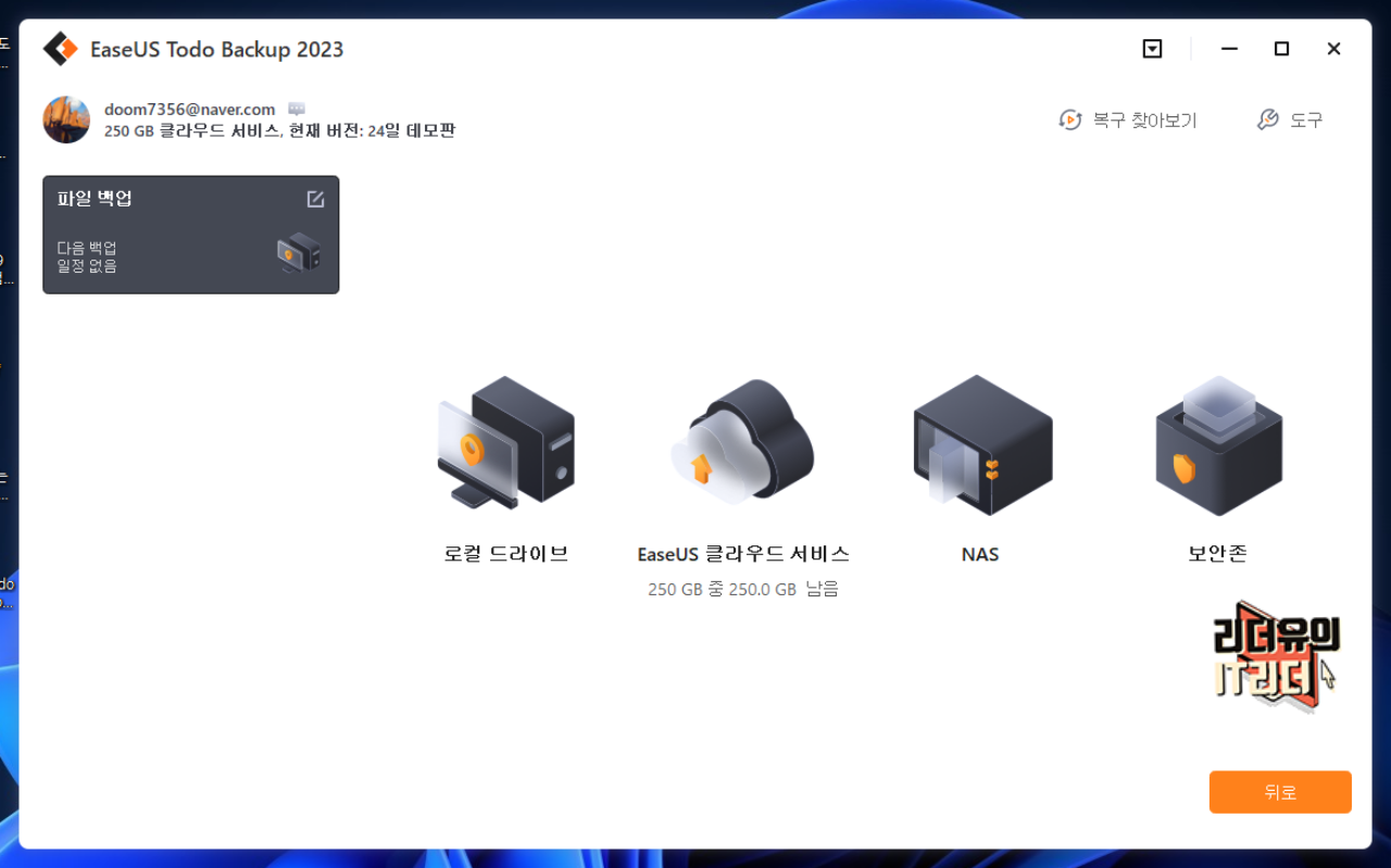 로컬 드라이브에 할 지, EaseUS 클라우드 서비스에 할 지, NAS에 할 지, 보안존에 할 지 선택할 수 있게 나옵니다. 여기서 가장 매력적인 기능은 EaseUS 클라우드 서비스 입니다. 클라우드 서비스는 말그대로 인터넷 상에 백업을 할 수 있게 하는 것입니다.