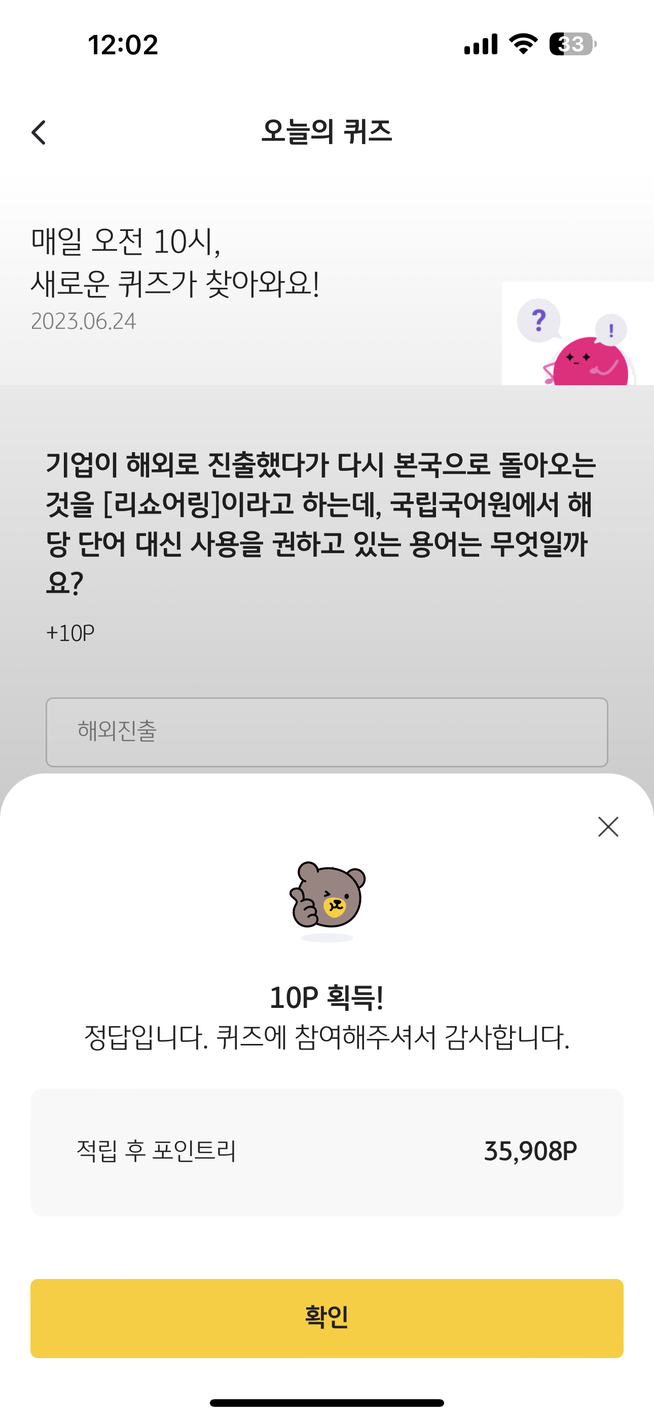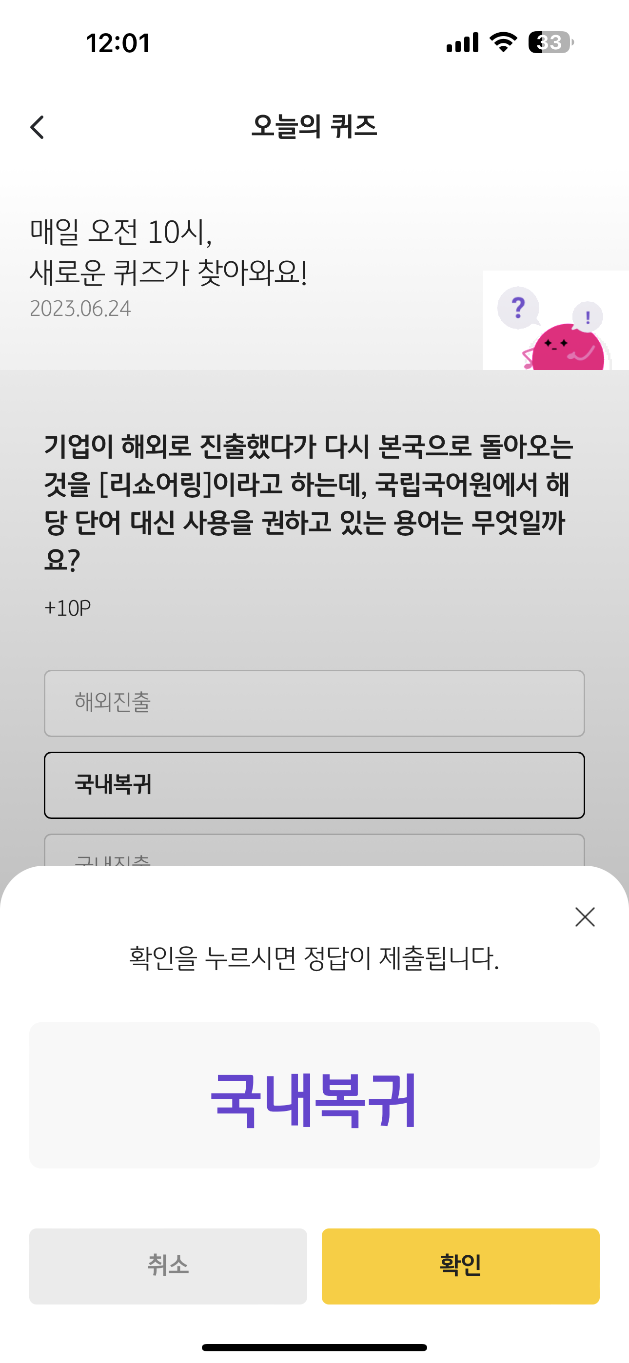 KB Pay 오늘의 퀴즈 정답은 국내복귀 입니다