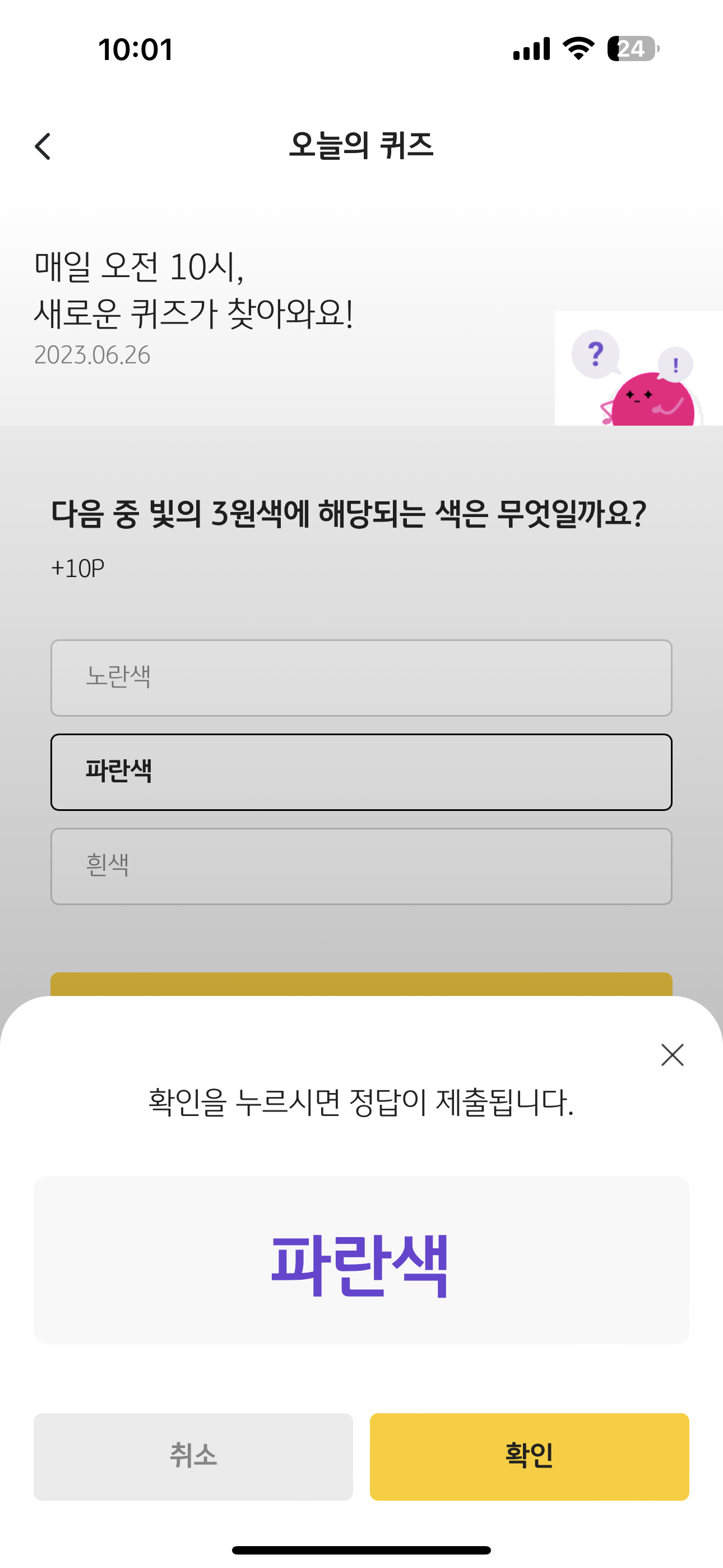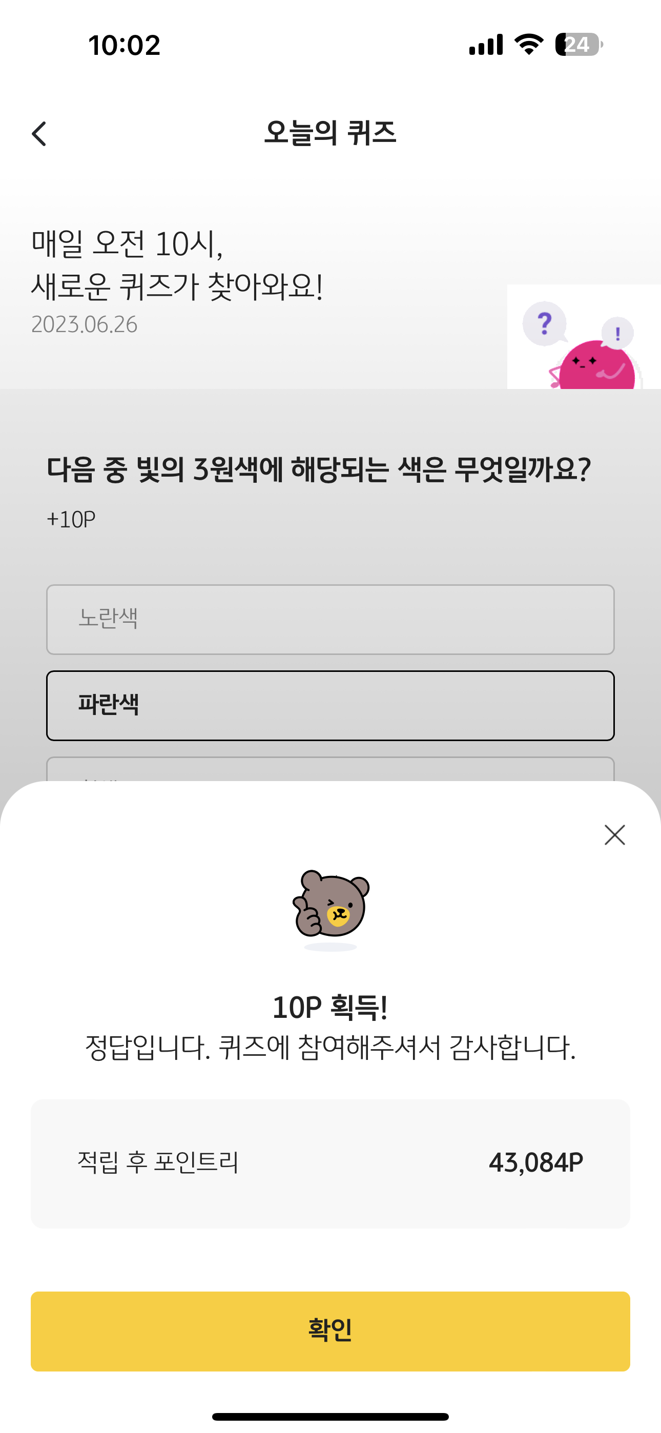 KB Pay 오늘의 퀴즈 정답은 파란색 입니다