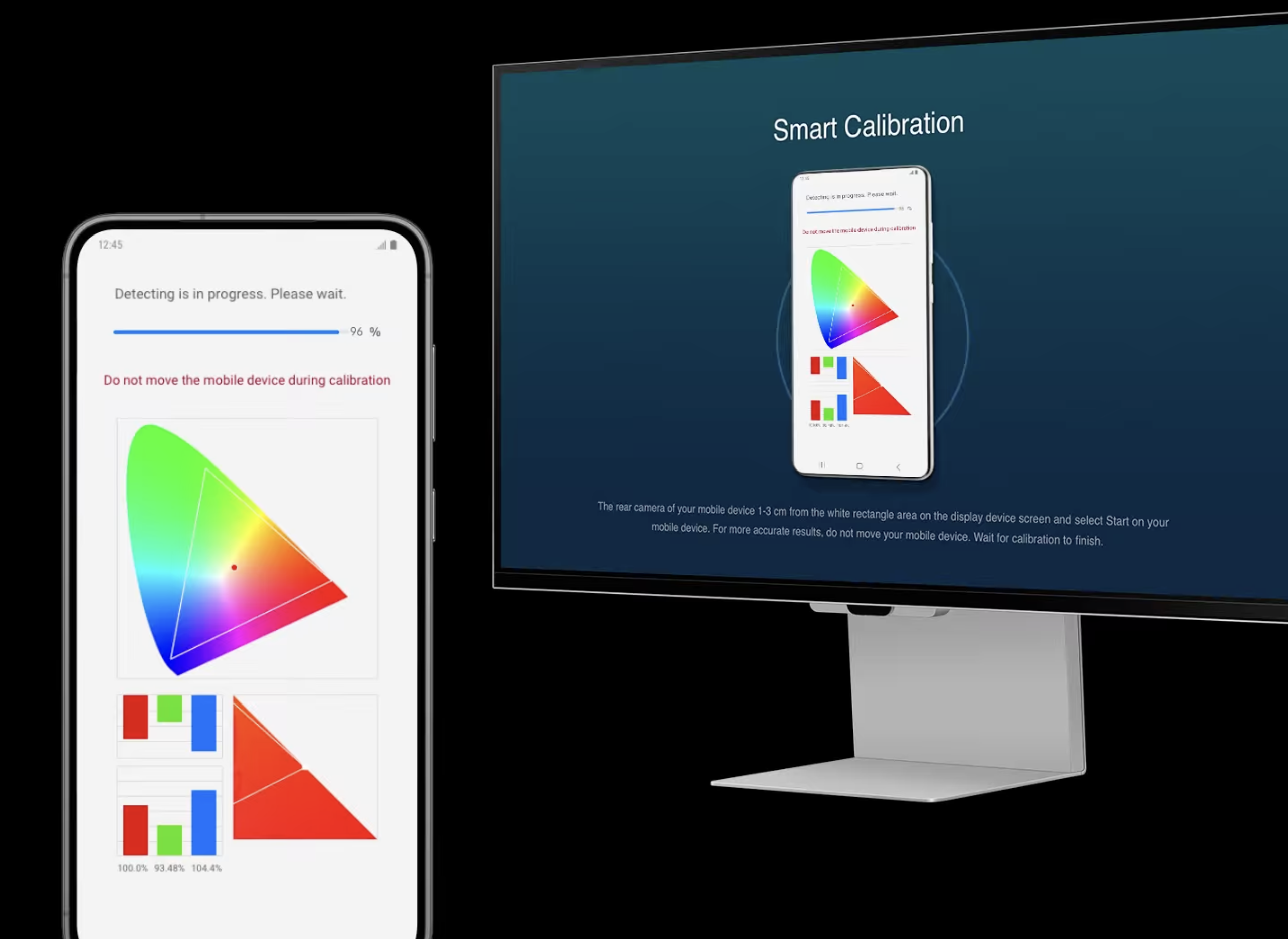 스마트 캘리브레이션은 스마트싱스(SmartThings)앱을 실행하고 뷰피니티 S9 화면 중앙에 스마트폰 카메라를 갖다 대면 설정모드에 따라 밝기와 감마 값 외에도 색 온도와 색 영역 기준을 선택해 사용자가 원하는 색상을 정교하게 설정할 수 있습니다.