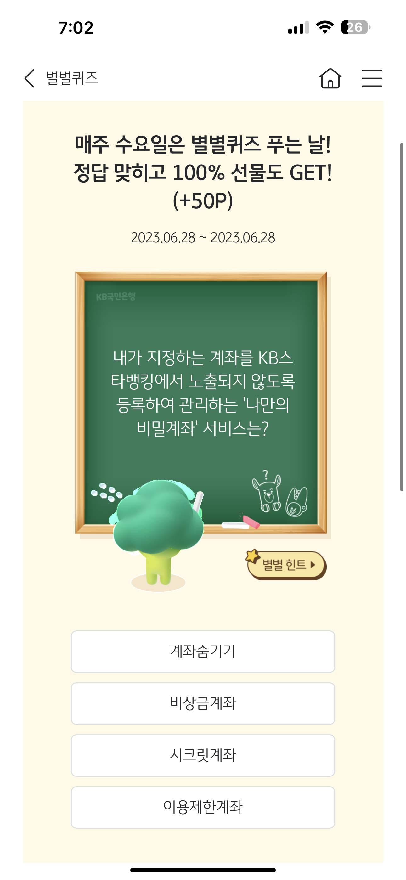 KB스타뱅킹 별별퀴즈 6월 28일 문제입니다