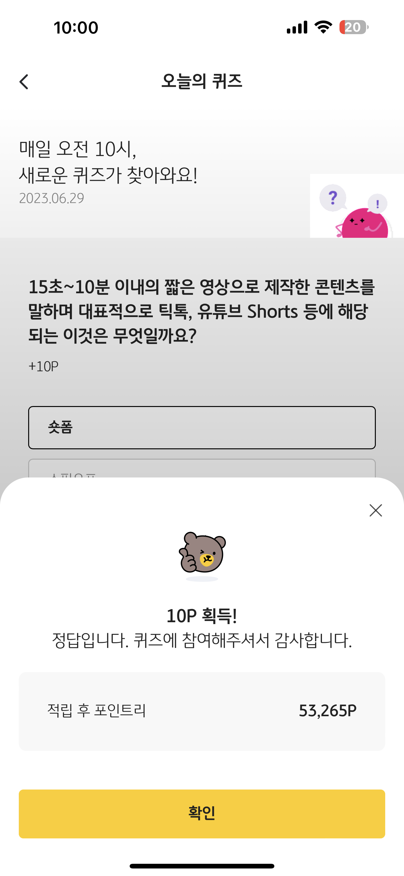KB Pay 오늘의 퀴즈 정답은 숏폼 입니다
