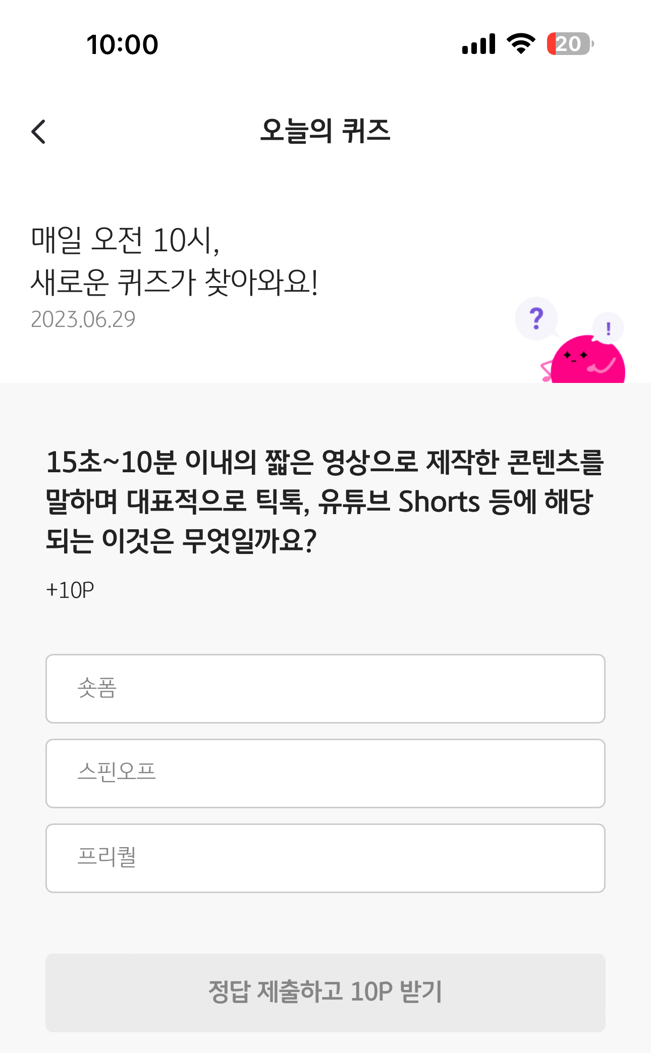 KB Pay 오늘의 퀴즈 정답은 숏폼 입니다