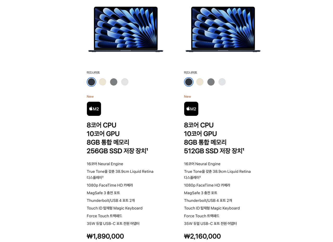 애플 맥북에어 15 가격은 1,890,000원 부터 시작합니다. 다만 저장공간이 256GB로 작기 때문에 정말 심플하게 사용할 유저가 아니라면 이왕이면 512GB 저장공간을 제공하는 2,160,000원 짜리가 좋습니다. 물론 이건 각자의 재정상황에 맞게 선택하면 되겠죠. 기본형 모델도 충분히 매력적이고 맥북 입문용으로 매력적이니 잘 참고해서 좋은 선택하시기 바랍니다.