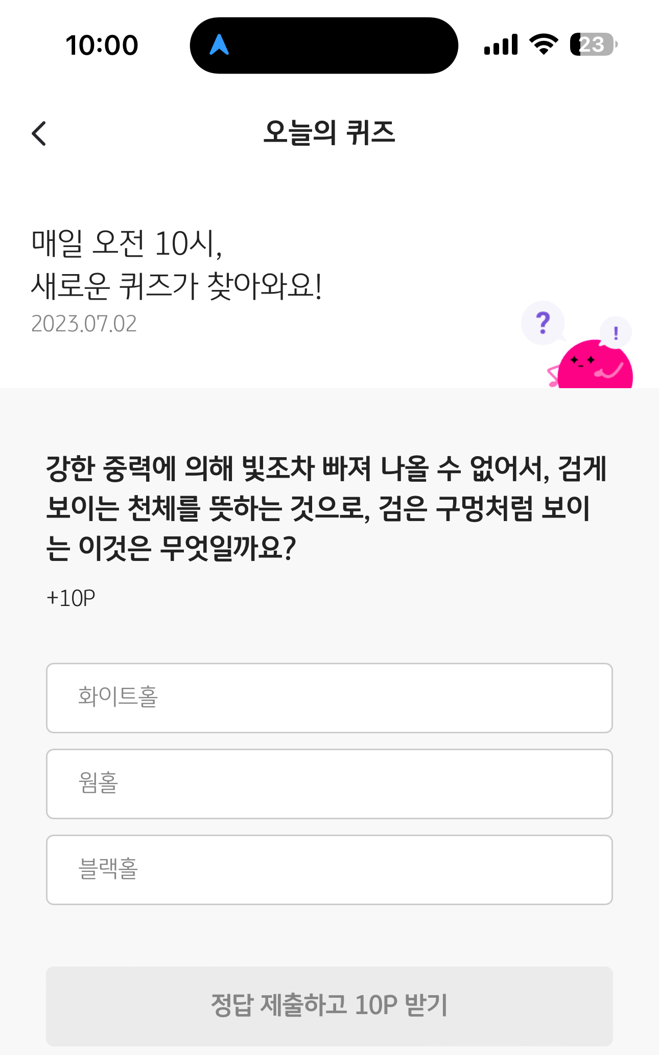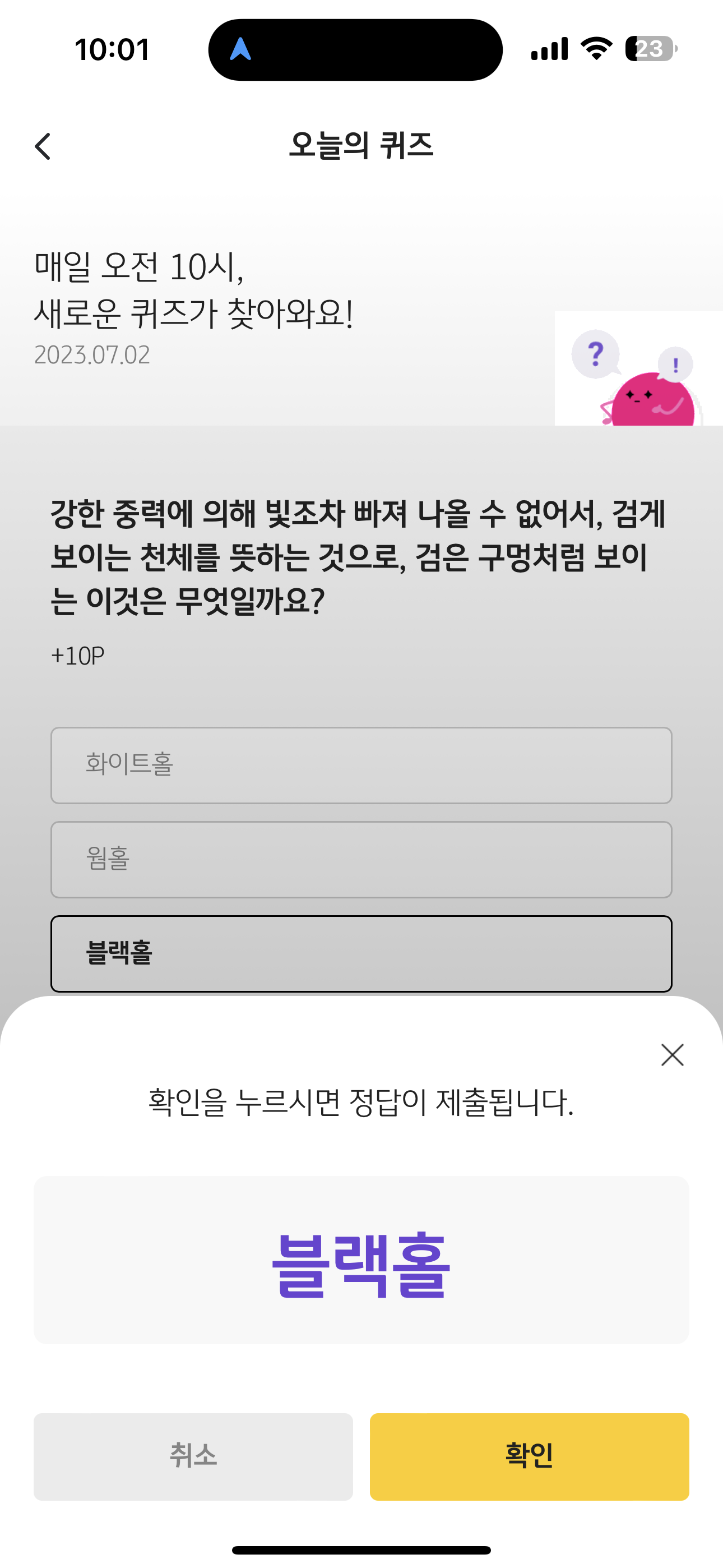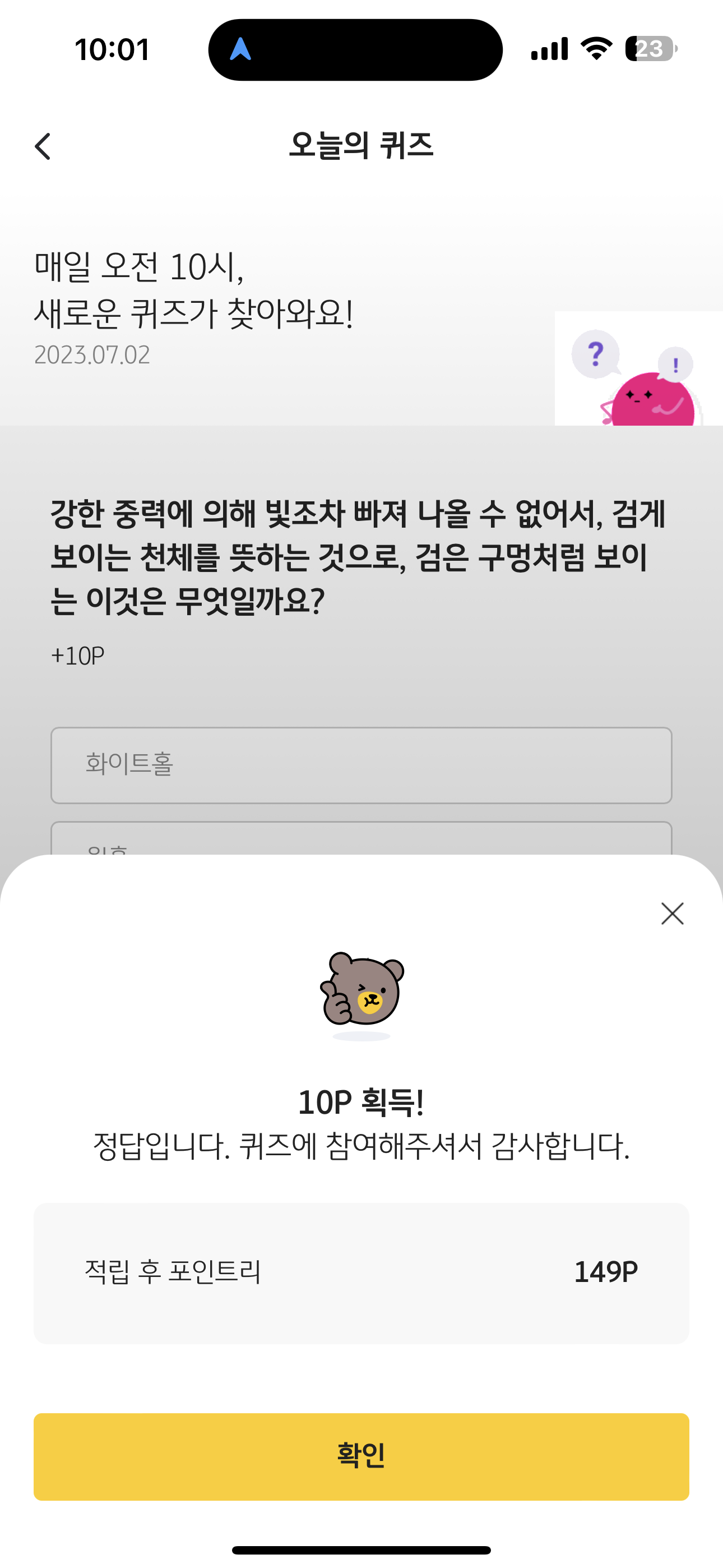KB Pay 오늘의 퀴즈 정답은 블랙홀 입니다