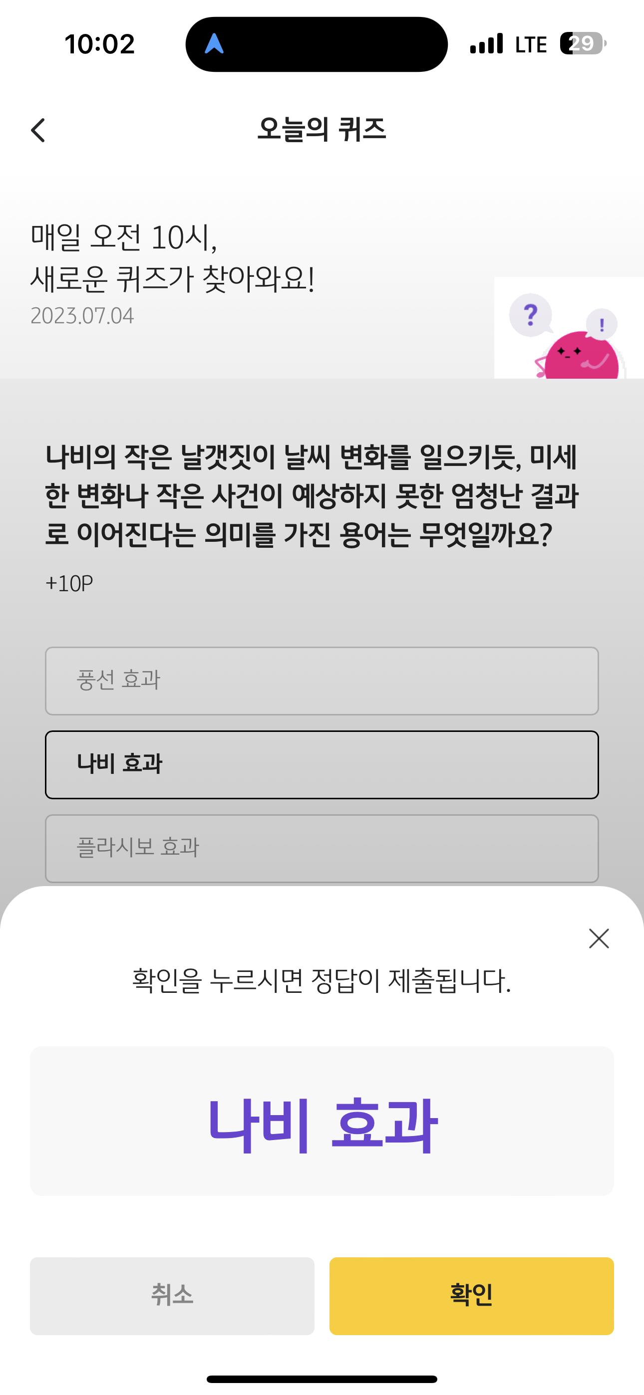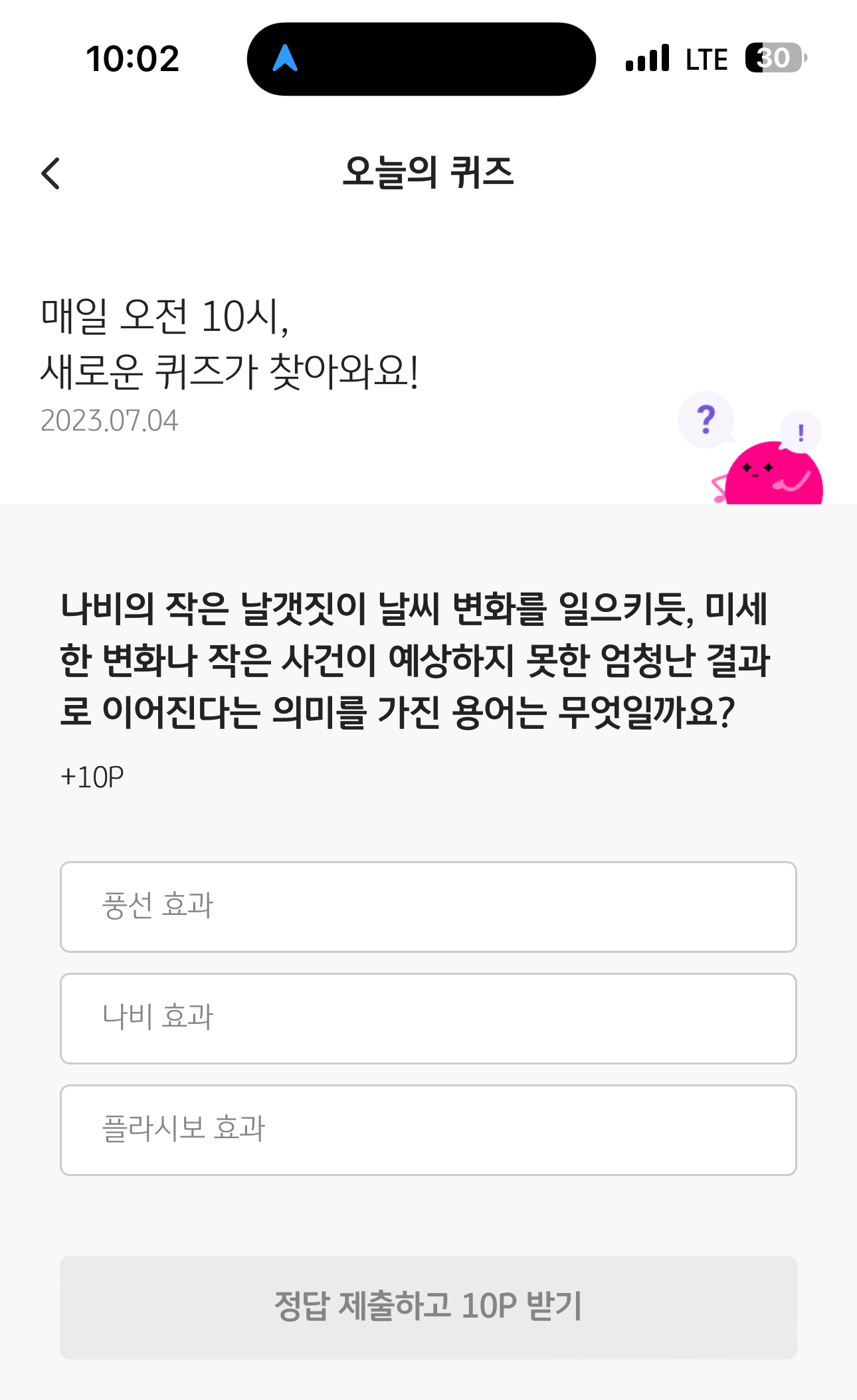 KB Pay 오늘의 퀴즈 정답은 나비 효과 입니다