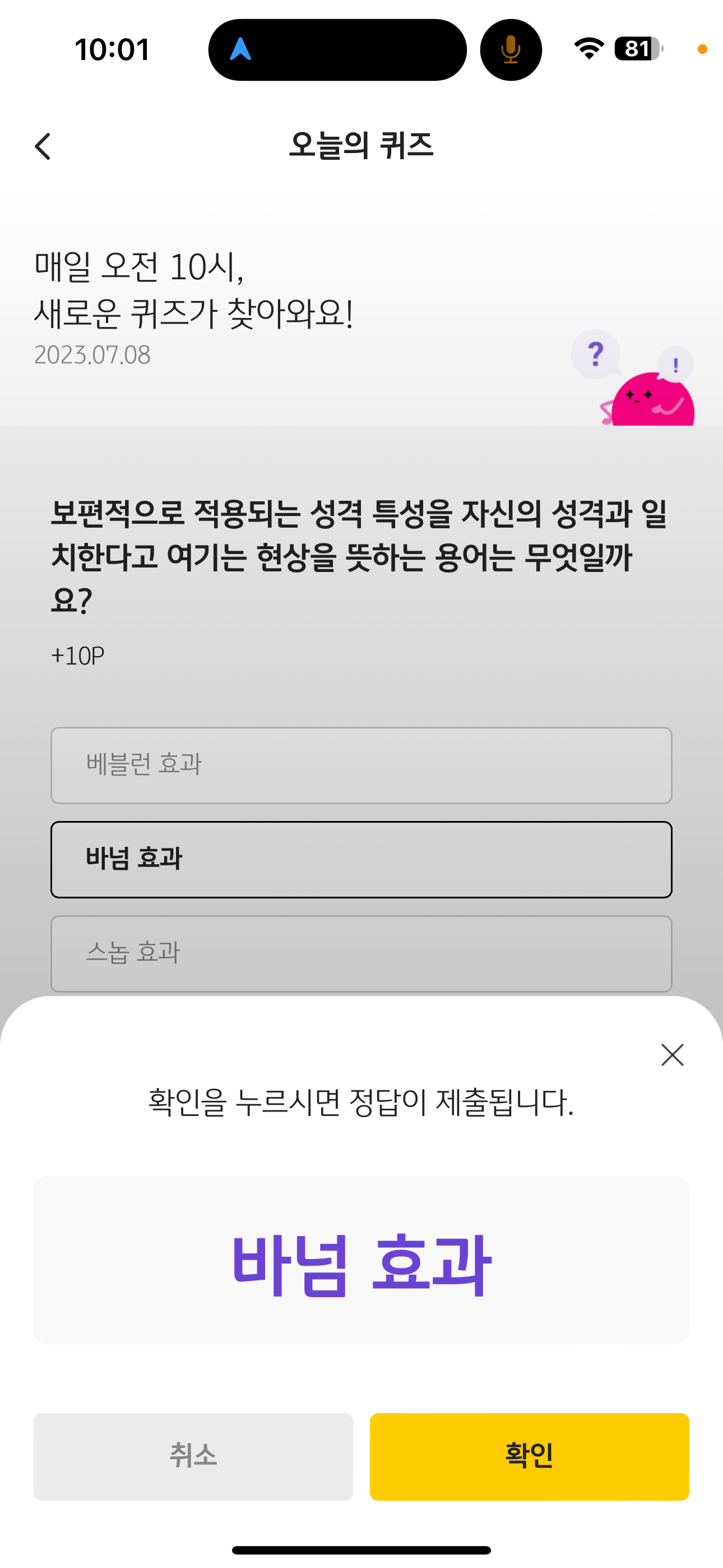 KB Pay 오늘의 퀴즈 정답은 바넘 효과 입니다