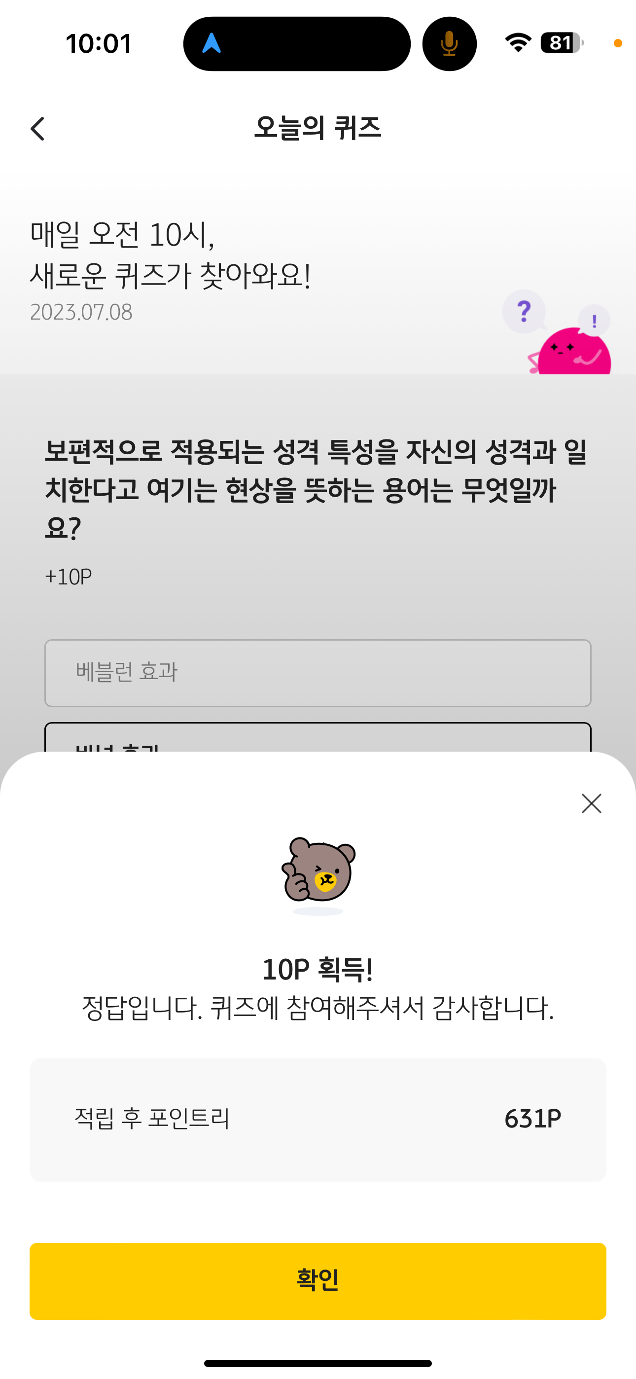 KB Pay 오늘의 퀴즈 7월 8일 정답(보편적으로 적용되는 성격 특성을 자신의 성격과 일치한다고 여기는 현상을 뜻하는 용어)